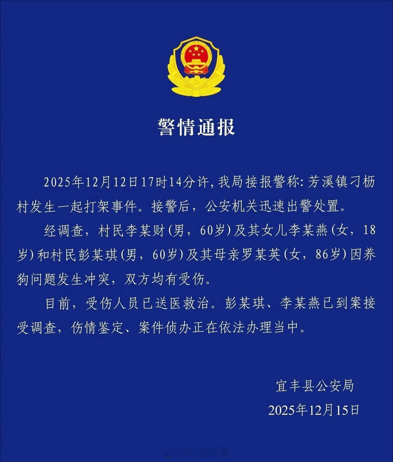 老人家门口吃橘子被邻居一拳打倒在地12月15日,宜丰公安发布警情通报:2025年12月12日17时14分许,我局接报警称:芳溪镇刁枥村发生一起打架事件。接警后,公安机关迅速出警处置。经调查,村民李某财(男,60岁)及其女儿李某燕(女,18岁)和村民彭某琪(男,60岁)及其母亲罗某英(女,86岁)因养狗问题发生冲突,双方均有受伤。目前,受伤人员已送医救治。彭某琪、李某燕已到案接受调查,伤情鉴定、案件侦办正在依法办理当中。同城热点创作计划