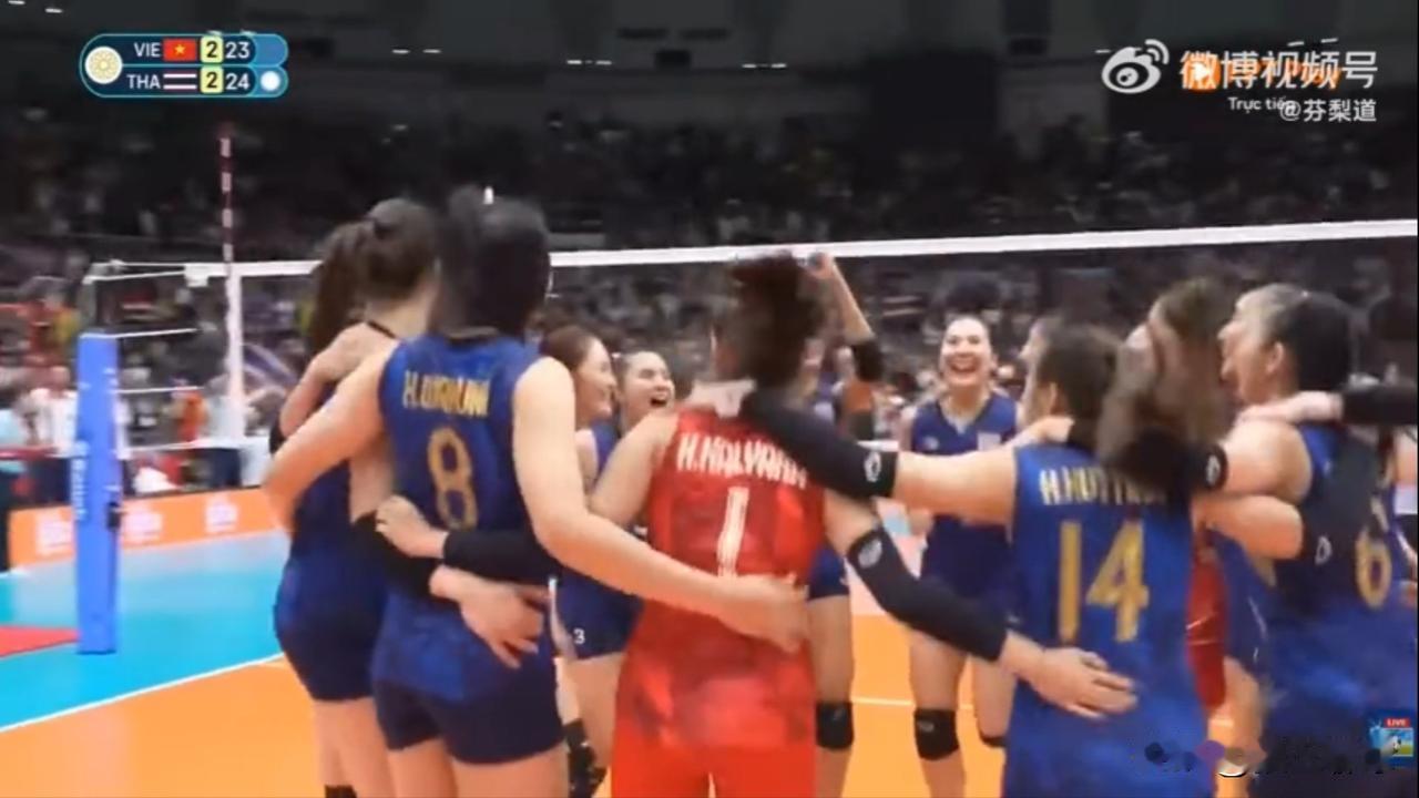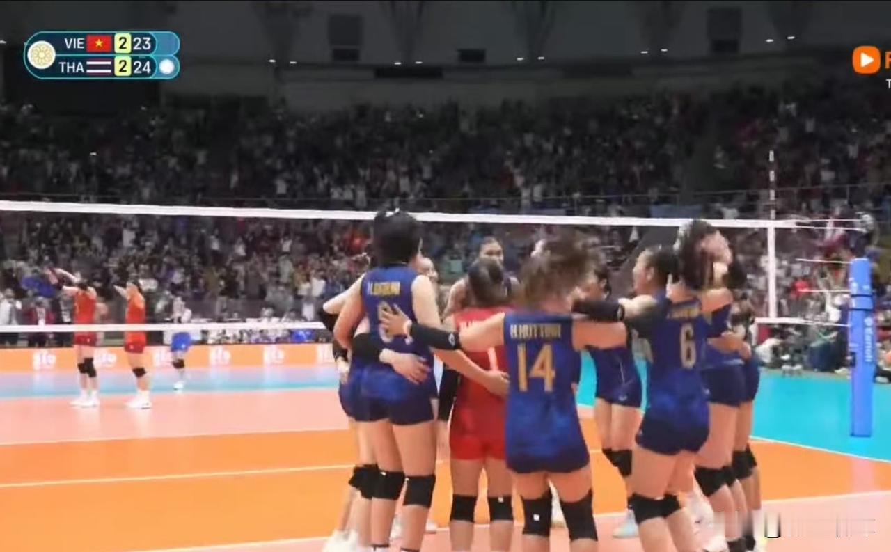 东南亚运动会女排决赛:泰国队3-2(19-25/25-13/25-18/23-25/25-23)越南队 泰国队克服先丢一局,决胜局5-10的被动,先后挽救5个冠军点,兑现本队第7个冠军点,经历五局大战惊险击败越南队,本世纪以来在本项赛事完成13连冠!越南队依然与本项赛事金牌无缘,4连亚(全部输给泰国队),也是总第12个亚军。 平皮查亚再见Ace,赛后好几位球员都哭了……越南女排还是差了一丢丢 ​​​。 恭喜泰国女排蝉联联联联联……冠军,越南女排有点可惜,但尽力了。听听越南转播机构解说在球队几次拿到冠军点时有多“激动”。 越南队再次与东南亚运动会女排项目金牌无缘,自由人阮庆当赛后哭到控制不住…… 第后一张图冯坤和儿子也在,但不确定是否是今天的现场图…… ​​​