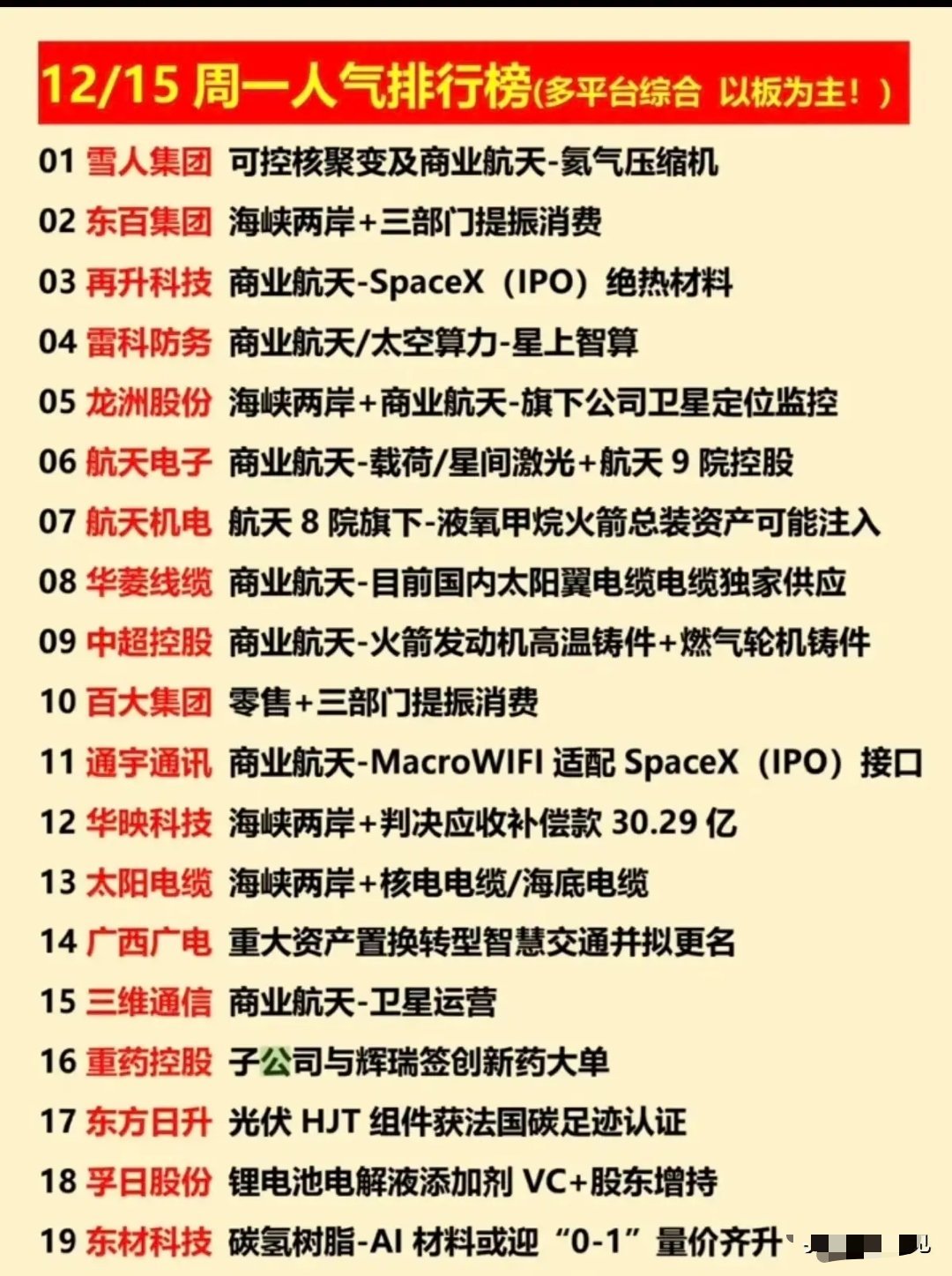 12月15日多平台人气股榜单简析今日市场主线明确为商业航天,海峡两岸与消费题材构成核心副线,光伏、锂电、医药等细分赛道同步活跃。个股人气多由概念稀缺性、事件驱动、政策利好及资产运作预期共同推动。个股亮点速览1. 雪人集团:手握可控核聚变与商业航天氦气压缩机稀缺技术,稳居赛道标杆。2. 东百集团:海峡两岸题材叠加消费政策红利,成双主线共振标的。3. 再升科技:绝热材料适配SpaceX IPO,借顶级事件站上商业航天风口。4. 雷科防务:聚焦星上智算,卡位“航天+算力”稀缺赛道。5. 龙洲股份:兼具海峡两岸属性与卫星定位监控业务,双题材驱动人气。6. 航天电子:航天9院控股,凭载荷与星间激光技术筑牢国企标的地位。7. 航天机电:航天8院背景加持,液氧甲烷火箭资产注入预期引关注。8. 华菱线缆:国内太阳翼电缆独家供应,凭绝对稀缺性领跑细分领域。9. 中超控股:布局火箭发动机高温铸件,锚定航天装备制造赛道。10. 百大集团:纯消费零售标的,依托政策利好跻身人气榜单。11. 通宇通讯:MacroWIFI技术适配SpaceX接口,绑定国际龙头事件。12. 华映科技:海峡两岸题材叠加30.29亿应收补偿款,双利好提振人气。13. 太阳电缆:海峡两岸概念+核电、海底电缆业务,多元布局获青睐。14. 广西广电:资产置换转型智慧交通,成榜单中独特资本运作标的。15. 三维通信:深耕卫星运营,差异化卡位商业航天下游环节。16. 重药控股:子公司与辉瑞签下创新药大单,撑起医药赛道人气。17. 东方日升:HJT组件获法国碳足迹认证,凭技术优势代表光伏上榜。18. 孚日股份:锂电池电解液添加剂业务+股东增持,双利好助力锂电赛道突围。19. 东材科技:碳氢树脂瞄准AI材料领域,“0-1”突破预期成核心看点。榜单总结本次榜单中商业航天占据半壁江山,稀缺技术、SpaceX IPO事件、国企背景是核心吸睛要素;海峡两岸与消费题材政策、地域共振,形成强势副线;光伏、锂电、医药等赛道则依靠技术认证、合作大单等单点利好,成为市场补充。整体来看,具备独家优势或强事件驱动的标的更受资金青睐。
