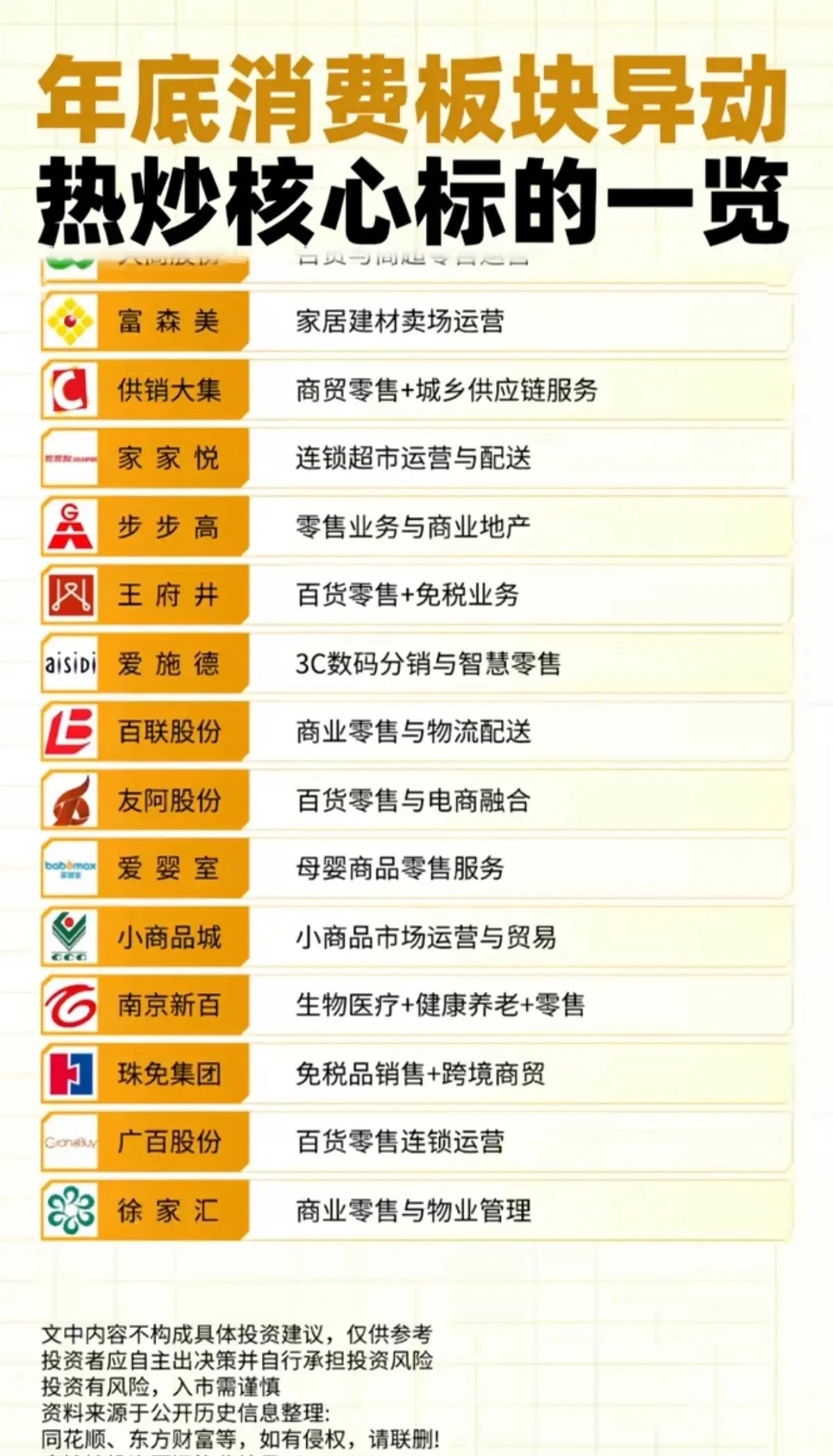 年底消费板块异动:热炒核心标的一览!1.百货零售2.食品饮料3.母婴商品4.超市运营配送、