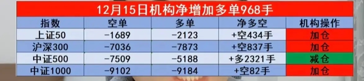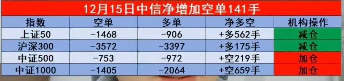 12.15周一晚间 中信机构小幅加仓!最新期指数据来了!中信净增加空单141手机构净增加多单968手从期指数据看,今天中信小幅加仓,但是机构却是减仓,需要警惕。日元大概率加息影响外围,年底临近,资金面紧张需要控制好仓位不排除大盘靠近3730点附近。不作为投资买卖建议,仅供参考、