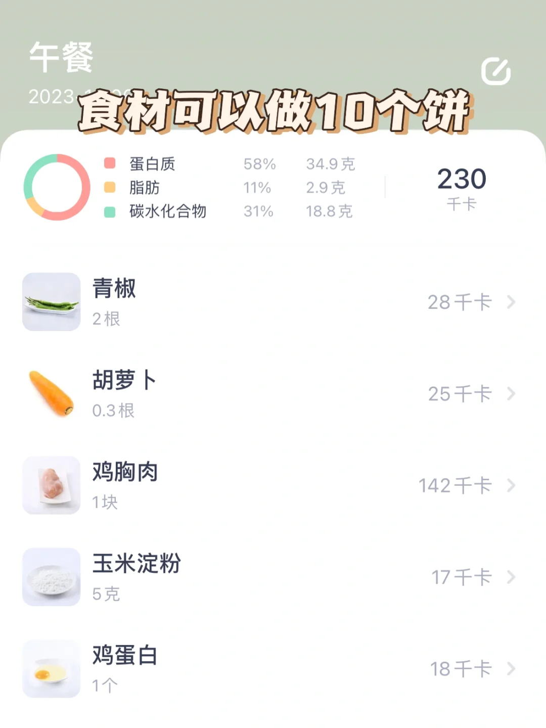 🥗食材:鸡胸肉1块、胡萝卜、青椒(做了10个饼)