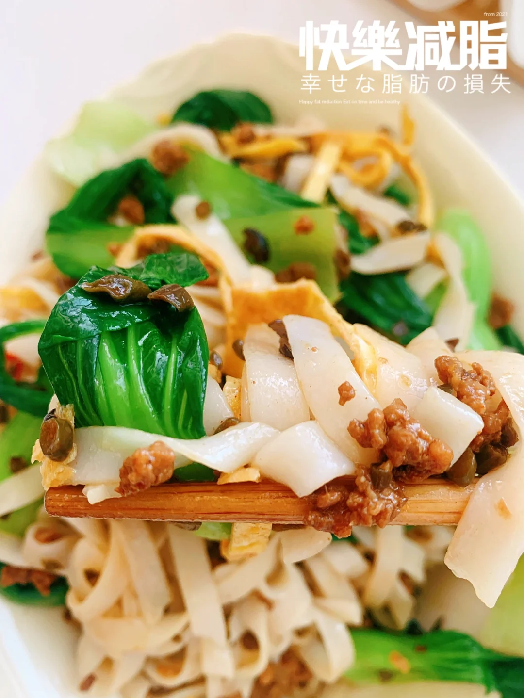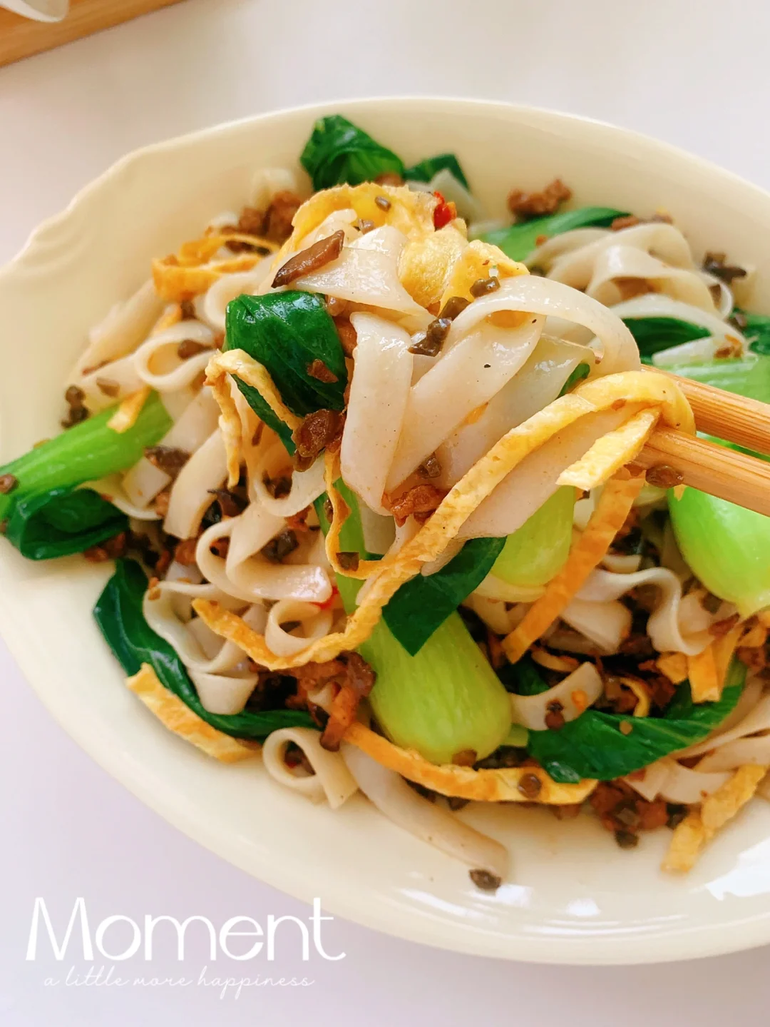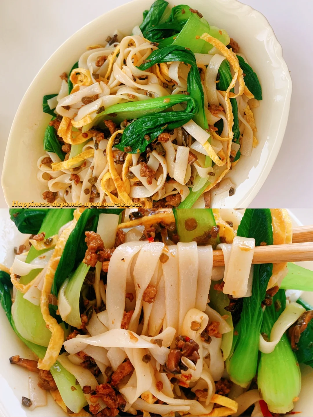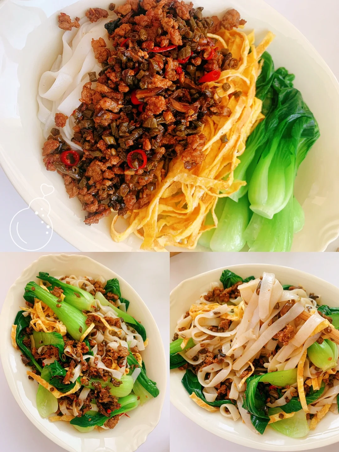 4️⃣将炒熟的肉沫和河粉,鸡蛋丝,青菜拌匀即🉑。