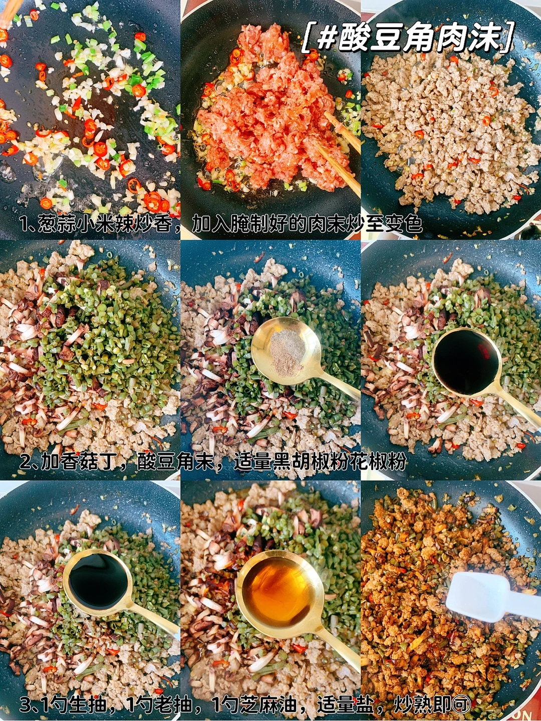 3️⃣倒入香菇丁,酸豆角,加适量花椒粉,和胡椒粉,1勺生抽,1勺老抽,适量盐炒熟。