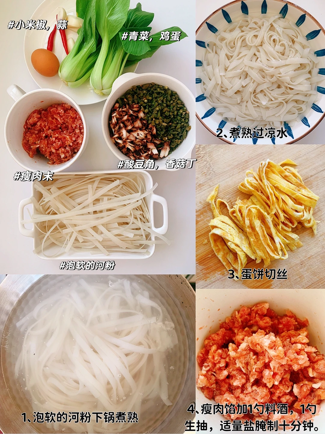 1️⃣泡软的河粉下锅煮熟过凉水备用,鸡蛋煎饼切丝,瘦肉末加1勺料酒,1勺生抽,适量盐腌制十分钟,青菜焯水煮熟。