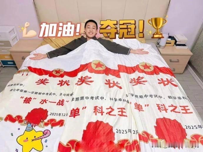 用奖状做被子的创意太天才了,这个造型的被子你愿意用不?浙江杭州一所学校最近别出心裁,将期中考试的奖状制作成了被子,作为奖品发给了相应的学生。想象一下每天盖着这样的被子睡觉那是什么样的心情?在我看来这属于非常了不起的正面心理暗示,久而久之会在心里面产生巨大的激励作用。要是我们那时候有这样的奖状被子,我一定天天盖着。