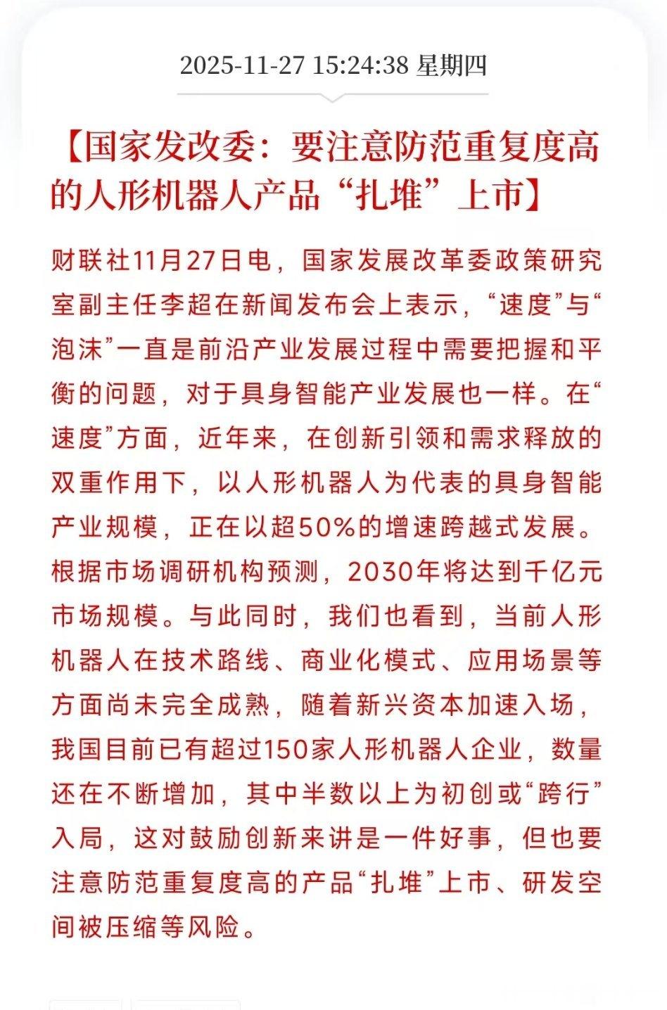 发改委:注意防范重复度高的人形机器人产品“扎堆”上市。