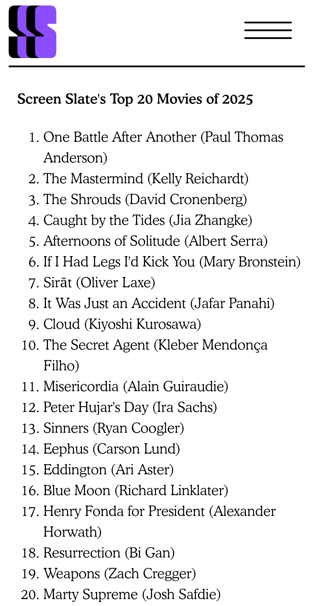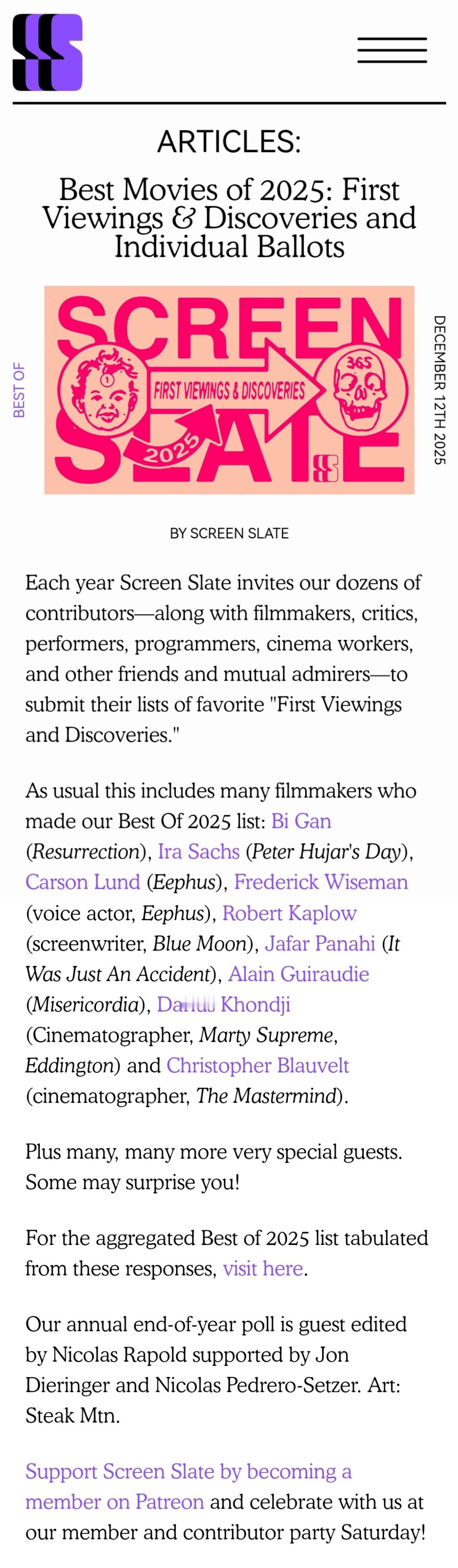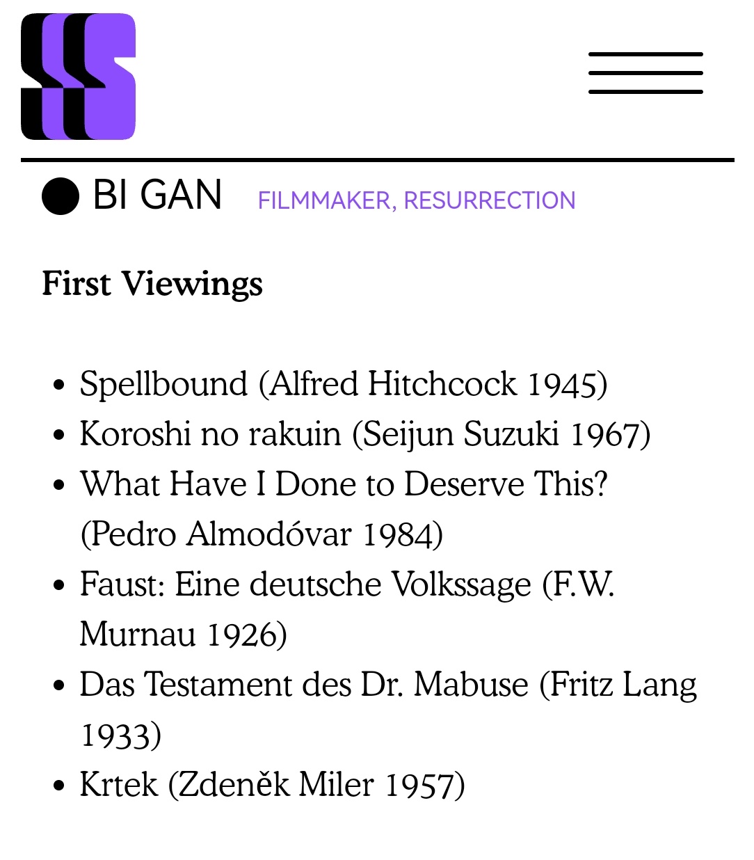 🔴个人补档个人学习⚫毕赣《狂野时代》入选《银幕石板Screen Slate》2025最佳影片TOP20榜单第18名👉🏻图1图2⚫毕赣作为《银幕石板Screen Slate》2025最佳影片TOP20榜单上榜者,为《银幕石板》每年的固定栏目《初次观影与新发现First Viewings and Discoveries》提交了自己的一份推荐片单↓↓↓👉🏻图3图4BI GAN 毕赣 FILMMAKER电影制作人RESURRECTION狂野时代First Viewings 初次观影推荐片单▪️Spellbound爱德华大夫 (Alfred Hitchcock 阿尔弗雷德·希区柯克1945) ▪️Koroshi no rakuin杀手烙印 (Seijun Suzuki 铃木清顺1967)▪️What Have I Done to Deserve This?我为什么命该如此? (Pedro Almodóvar 佩德罗·阿莫多瓦 1984)▪️Faust: Eine deutsche Volkssage浮士德 (F.W. Murnau F.W.茂瑙 1926)▪️Das Testament des Dr. Mabuse马布斯博士的遗嘱 (Fritz Lang 弗里茨·朗 1933)▪️Krtek鼹鼠的故事 (Zdeněk Miler 兹德内克·米莱尔 1957)