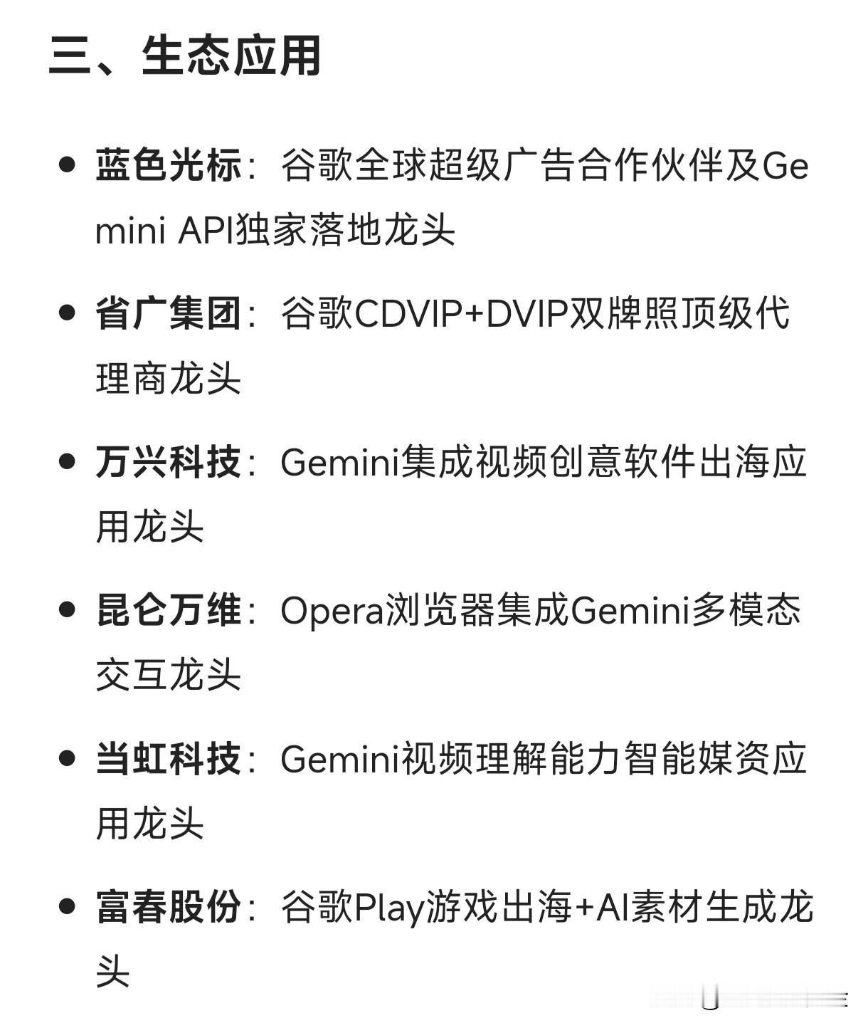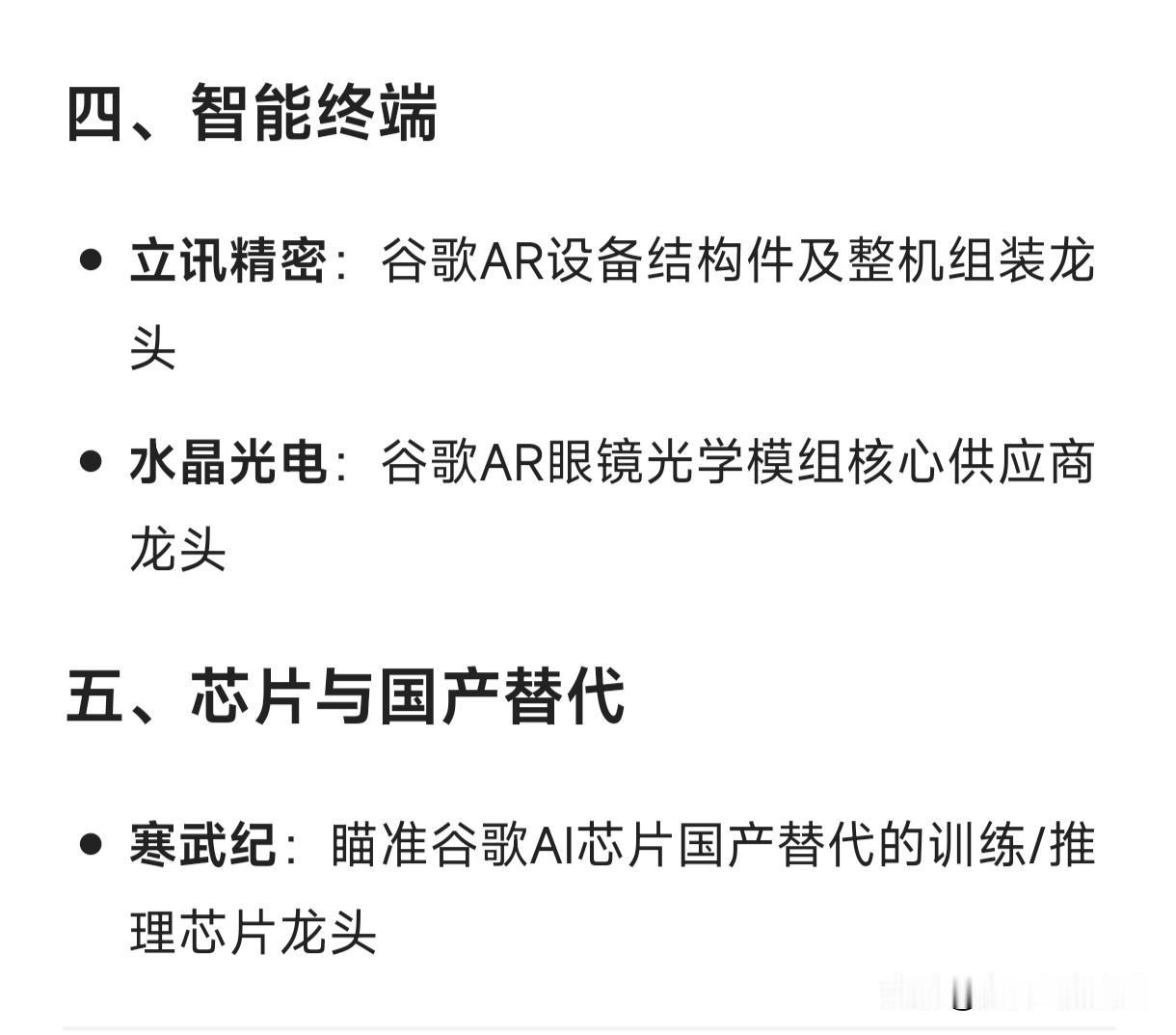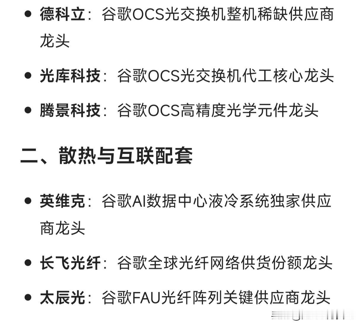 谷歌概念龙头汇总 一、算力基础设施 中际旭创:谷歌800G/1.6T光模块核心供应商龙头 新易盛:谷歌高速光模块第二大供应商龙头 工业富联:谷歌AI服务器整机代工龙头 沪电股份:谷歌TPU高端PCB核心供应商龙头 胜宏科技:谷歌数据中心UBB板全球市占率龙头 德科立:谷歌OCS光交换机整机稀缺供应商龙头 光库科技:谷歌OCS光交换机代工核心龙头 腾景科技:谷歌OCS高精度光学元件龙头 二、散热与互联配套 英维克:谷歌AI数据中心液冷系统独家供应商龙头 长飞光纤:谷歌全球光纤网络供货份额龙头 太辰光:谷歌FAU光纤阵列关键供应商龙头 三、生态应用 蓝色光标:谷歌全球超级广告合作伙伴及Gemini API独家落地龙头 省广集团:谷歌CDVIP+DVIP双牌照顶级代理商龙头 万兴科技:Gemini集成视频创意软件出海应用龙头 昆仑万维:Opera浏览器集成Gemini多模态交互龙头 当虹科技:Gemini视频理解能力智能媒资应用龙头 富春股份:谷歌Play游戏出海+AI素材生成龙头 四、智能终端 立讯精密:谷歌AR设备结构件及整机组装龙头 水晶光电:谷歌AR眼镜光学模组核心供应商龙头 五、芯片与国产替代 寒武纪:瞄准谷歌AI芯片国产替代的训练/推理芯片龙头
