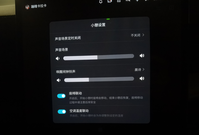 蔚来小憩模式 每天早起上班,到中午就有点犯困。 下午的工作状态全靠中午小眯一会。 趴办公桌又睡不舒服,只能躺车里躺平。 上车呼叫nomi小憩模式,自动展开座椅,打开空调,休息时间长短可自己屏幕上调整,唤醒铃声和背景画面也可以随个人喜好调整。 女王副驾的脚托小憩模式中无法自动打开,我都是手动调节,不知道能否在设置中解决