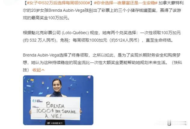 不承认不行,这个才20岁的加拿大女孩是个狠人! 中了500多万元彩票后放弃一次性领取, 选择每周领5000多元! 不得不说女孩真是太聪明了,相当于给自己找了一个铁饭碗的工作。还不用上班,周周可以领取。如果一次性领取就会被朋友骗,做各种投资,甚至被不好的男人惦记上。或者遇到亲戚朋友天天跟你借钱,所以周周领取是对的,这次被借走了被骗光了,下周还有钱。 这属于领取了一份跟生命等长的现金流了,不用担心渣男惦记,也不用担心高额税费,更不用担心自己控制不住高消费破产,比起一次性拿到的现金,属于睿智之选,她还这么年轻,一定会有美好的生活,如果能再拿出来一部分找我规划保险就更完美[呲牙] 如果是你,选择一夜暴富,还是一生安稳? 问我我怎么选?让我中了,您说了算,咋给我都行[呲牙][呲牙]