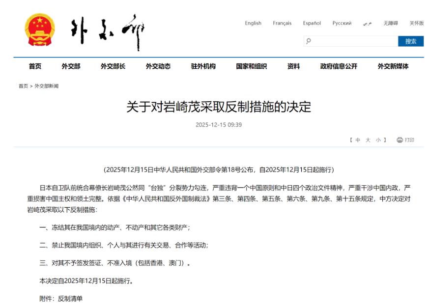 /日本政府与赖清德当局针对岩崎茂被制裁的回应来了:前者认怂,后者忐忑。中国一记重拳打出双重威慑! 岩崎茂这老头退休前是日本自卫队统合幕僚长,相当于三军总参谋长,手里攥过真家伙,退了休还不安分,非要往 “台独” 那堆里凑,今年 3 月直接接了赖清德当局的 “政务顾问”,天天琢磨着怎么帮 “台独” 分子找靠山,一会喊 “台湾有事就是日本有事”,一会撺掇日本把涉台内容写进安保文件,说白了就是拿着以前的身份当筹码,干着干涉中国内政的勾当。 中方这次下手是真干脆,直接按《反外国制裁法》来,冻结他在华所有财产,不准任何人和他做生意,还永久禁止入境。 岩崎茂之前还挂着日本几家在华有业务的企业顾问头衔,这一下不仅钱袋子空了,以后想踏足中国地盘都没门,纯属自作自受,搬起石头砸自己的脚。 再看日本政府的反应,那叫一个标准的 “认怂姿势”,之前岩崎茂刚接台当局顾问的时候,中方就提过抗议,当时日本官方就含糊其辞,说什么 “个人行为,政府管不着”,现在真被制裁了,反而连屁都不敢放一个,既不替岩崎茂辩解,也不指责中方,全程装哑巴。 为啥这么没脾气?还不是因为不敢赌。日本现在经济靠中国市场撑着,不少企业在华赚得盆满钵满,真要为了一个退休官员跟中国撕破脸,吃亏的是自己。 而且台湾问题是中国核心利益,中方早就把话摆明了,谁碰红线谁倒霉,日本心里门儿清,没必要为了一个 “过气高官” 丢了更大的利益,所以干脆认怂,沉默是金。 反观赖清德当局,表面上还想硬撑,说什么 “制裁影响不了台日交流”,背地里早就慌了神。 他们本来还指望拉着日本前军方大佬撑场面,想借外部势力给自己的 “台独” 行径壮胆,把岩崎茂当成打通日台勾连的 “敲门砖”。结果中方一出手就把这块砖给砸了,这不是明摆着打他们的脸吗? 赖清德当局心里比谁都清楚,这制裁不是冲岩崎茂一个人来的,是冲所有想勾连外部势力的 “台独” 分子来的警告。 之前中方制裁过不少 “台独” 顽固分子和涉台军售企业,这次连日本的重量级人物都没放过,他们能不忐忑吗?生怕下一个被制裁的就是自己身边的人,生怕以后没人敢再跟他们勾连,毕竟谁也不想跟钱过不去,更不想被永久禁止入境。 其实中方这记重拳打得特别准,打蛇打七寸。日本政府认怂,是因为利益面前不敢硬刚,知道在台湾问题上跟中国对着干没好果子吃;赖清德当局忐忑,是因为他们的 “台独” 美梦全靠外部势力撑腰,现在中方直接切断了他们的一条 “后路”,让他们明白外部势力根本靠不住。 这双重威慑可不是闹着玩的,不管是外国势力还是 “台独” 分子,只要敢碰台湾问题这条红线,中方就敢出手,而且出手就精准打击,让你得不偿失。 可能有人觉得,不就是制裁一个退休官员吗?其实不然,这背后是中方的态度和实力。 以前有些外国势力觉得可以随便干涉台湾问题,“台独” 分子也觉得有靠山就可以为所欲为,现在中方用实际行动告诉他们,时代变了,中国不再是以前那个可以任人拿捏的国家,谁要是敢分裂中国,谁要是敢干涉中国内政,不管你是谁,不管你来自哪个国家,都得付出代价。 日本政府的认怂,说明他们心里清楚轻重缓急,不敢拿国家利益赌;赖清德当局的忐忑,说明他们知道自己的行径不得人心,外部势力的支持根本就是镜花水月。 中方这一记重拳,既敲打了外部干涉势力,又震慑了 “台独” 分裂分子,双重效果拉满。往后那些还想在台湾问题上动歪心思的人,可得好好掂量掂量,别到最后落得个竹篮打水一场空,还得被钉在历史的耻辱柱上。