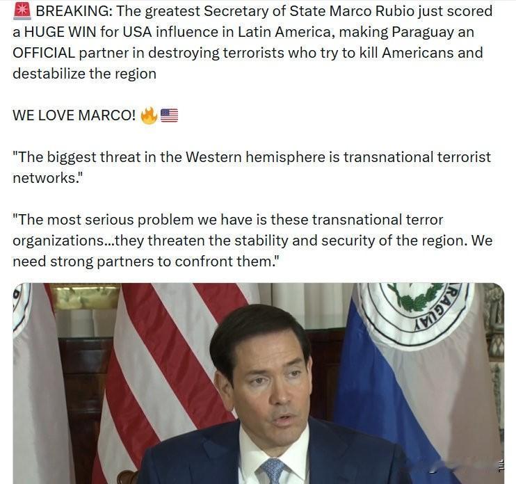 突发:国务卿Marco Rubio刚刚为美国在拉丁美洲的影响力赢得一场重大胜利,使巴拉圭正式成为打击试图杀害美国人并破坏地区稳定的恐怖分子的合作伙伴。 我们爱Marco! “西半球最大的威胁是跨国恐怖网络。” “我们面临的最严重问题是这些跨国恐怖组织……它们威胁着该地区的稳定与安全。我们需要强有力的伙伴来共同应对!”