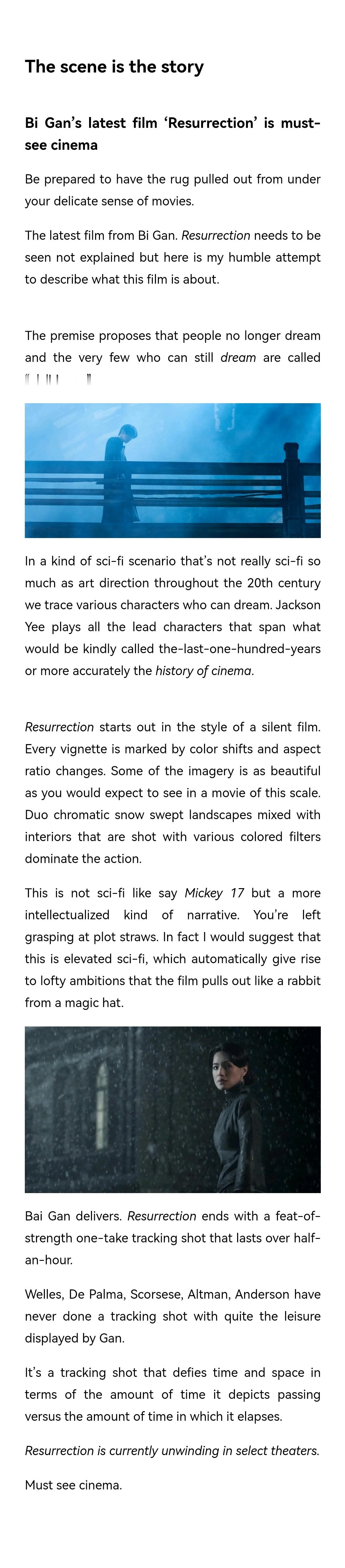 【Screen Reflections银幕映像】发布狂野时代最新长评电影狂野时代狂野时代海外影评狂野时代海外好评狂野时代北美上映 2025/12/15“The scene is the story”场景即故事By Michael Bergeron(文末附作者介绍)🔴狂野时代长评场景即故事毕赣最新电影《狂野时代》是不可错过的影院之作。请准备好,让你对电影纤细的认知被彻底颠覆。毕赣的最新作品《狂野时代》需要被观看,而非被解释,但在此我仍谦逊地尝试描述这部影片所讲述的内容。影片设定了一个前提:人们不再做梦,而极少数仍能做梦的人被称为“迷魂者”。在这样贯穿20世纪电影艺术电影史更胜于科幻设定的情境中,我们追溯了多位能够做梦的角色。易烊千玺饰演了所有跨越——客气地说是“最后一百年”——或更精确地说是“电影史”本史的角色。《狂野时代》以默片风格开场。每个片段都以色彩转换和画面比例变化为标记。部分影像之美,正如你对这种规格电影所期待的那样。双色调的、风雪席卷的景观,与使用各种彩色滤镜拍摄的内景交织,主导着影片的视觉呈现。这并非《编号17》那种科幻,而是一种更趋理念化的哲学叙事。你只能抓住零星的情节线索。事实上,我认为这是一种“更高阶的科幻”,这自然催生了影片如魔术师从礼帽中变出兔子般展现的崇高野心。毕赣做到了。《狂野时代》以一段长达半小时以上、展现非凡功力的“一镜到底”跟拍镜头作结。威尔斯、德·帕尔玛、斯科塞斯、奥特曼、安德森……从未有人完成过如毕赣这般从容不迫的长镜头。这是一个在时间与空间上均形成对抗的跟踪镜头——所描绘的时间流逝量与其实际持续时间形成了张力。《狂野时代》目前正在北美指定影院上映。这部影片是银幕必看之作。🔴作者介绍Michael Bergeron是一位电影评论家和专栏作家,现任Screen Reflections网站主笔,居住在德克萨斯州休斯顿市。他专注于电影视觉美学、叙事结构和影像文化批评,是当代电影评论界一位具有独特视角的声音。Bergeron的作品广泛发表于多家知名媒体: 《休斯顿纪事报》(Houston Chronicle) - 美国最大都市报之一《英国运动医学杂志》(British Journal of Sports Medicine)《Preview Houston》《TV Technology》 - 影视技术专业媒体《Byline Houston》《Rio Rancho Observer》等地方媒体平台