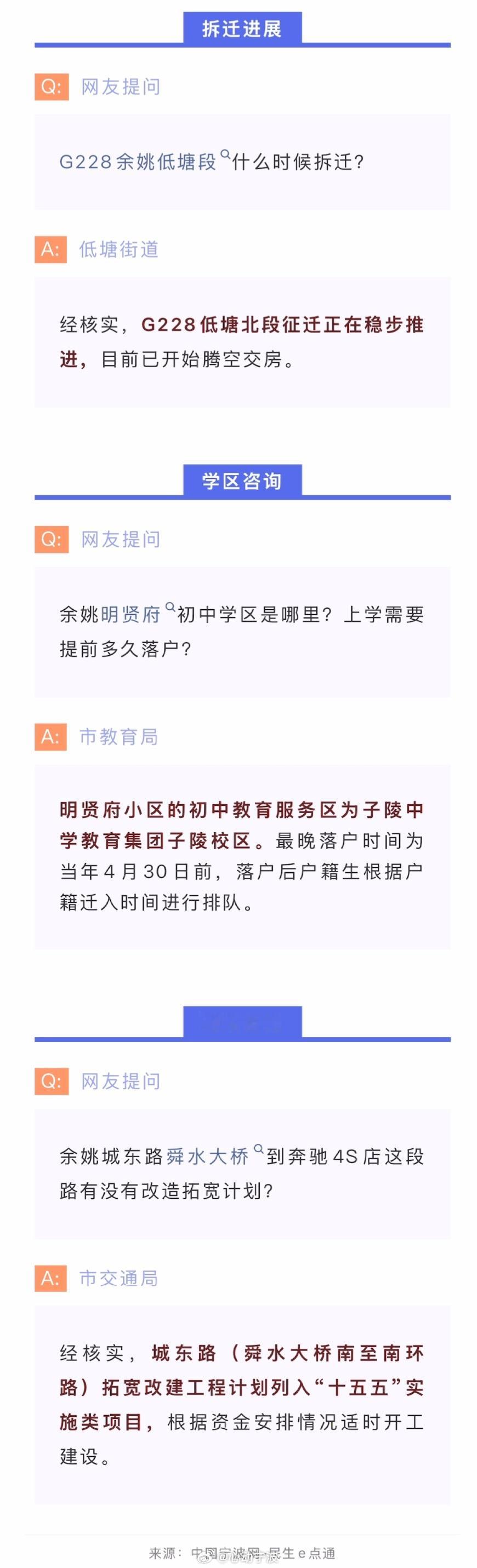 【宁波余姚关心的三个问题有最新回复 】Q:网友提问G228余姚低塘段什么时候拆迁?A:低塘街道经核实,G228低塘北段征迁正在稳步推进,目前已开始腾空交房。Q:网友提问余姚明贤府初中学区是哪里?上学需要提前多久落户?A:市教育局明贤府小区的初中教育服务区为子陵中学教育集团子陵校区。最晚落户时间为当年4月30日前,落户后户籍生根据户籍迁入时间进行排队。Q:网友提问余姚城东路舜水大桥到奔驰4S店这段路有没有改造拓宽计划?A:市交通局经核实,城东路(舜水大桥南至南环路)拓宽改建工程计划列入“十五五”实施类项目,根据资金安排情况适时开工建设。(中国宁波网-民生e点通)同城热点创作计划 宁波