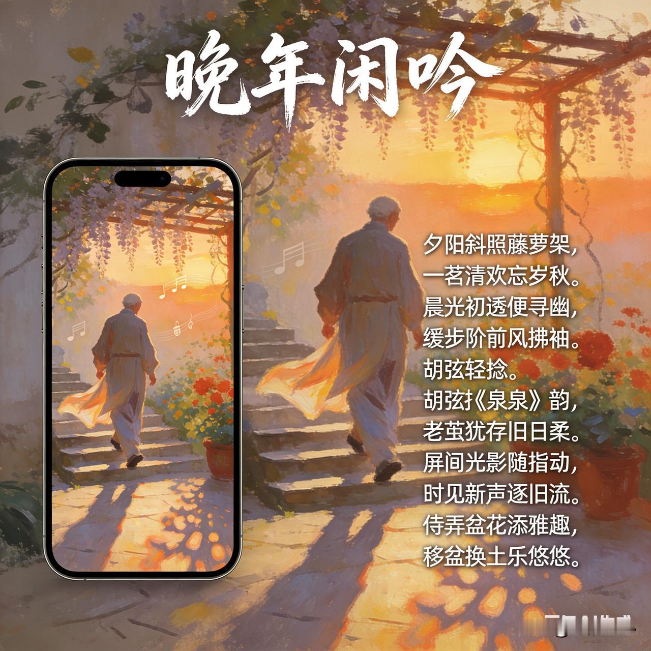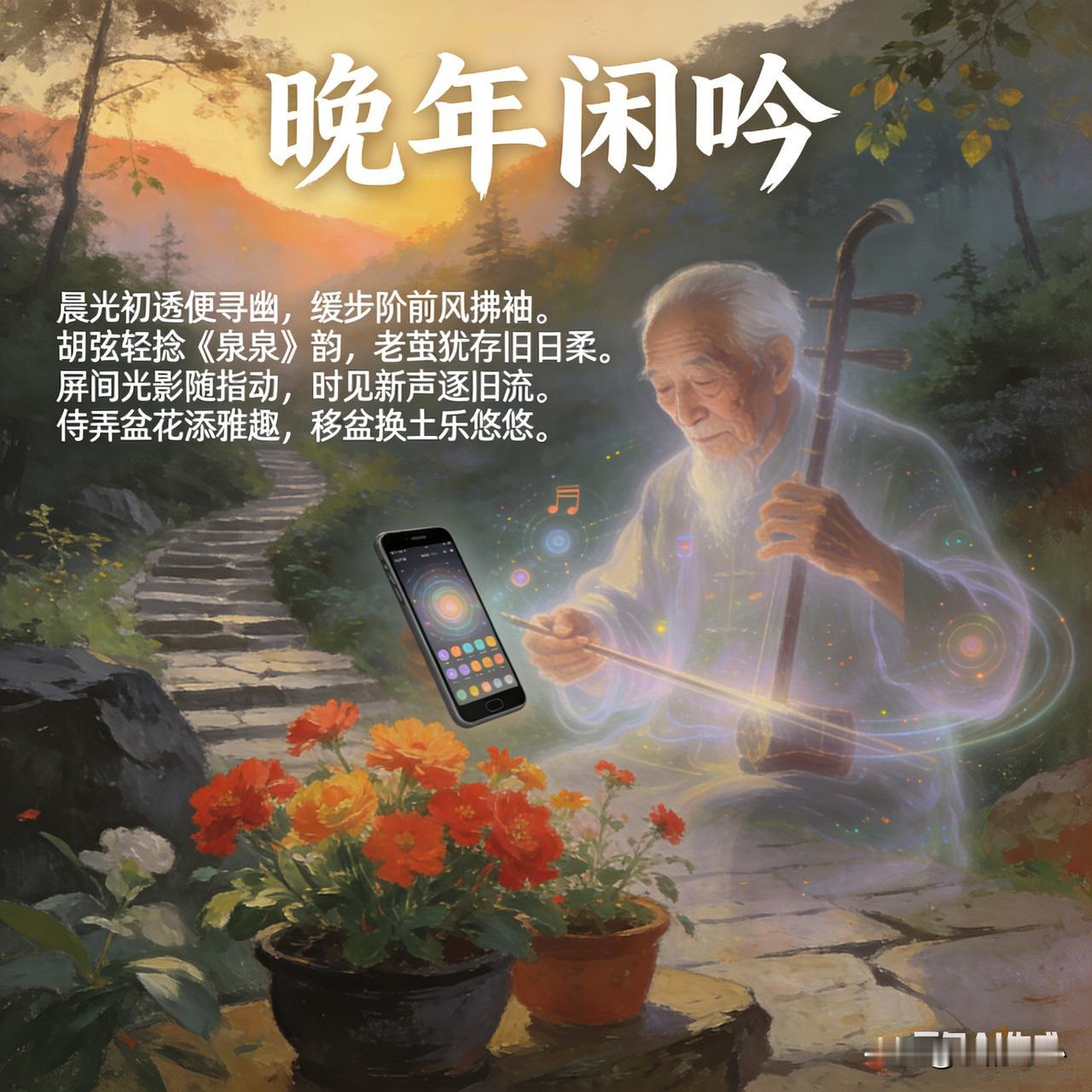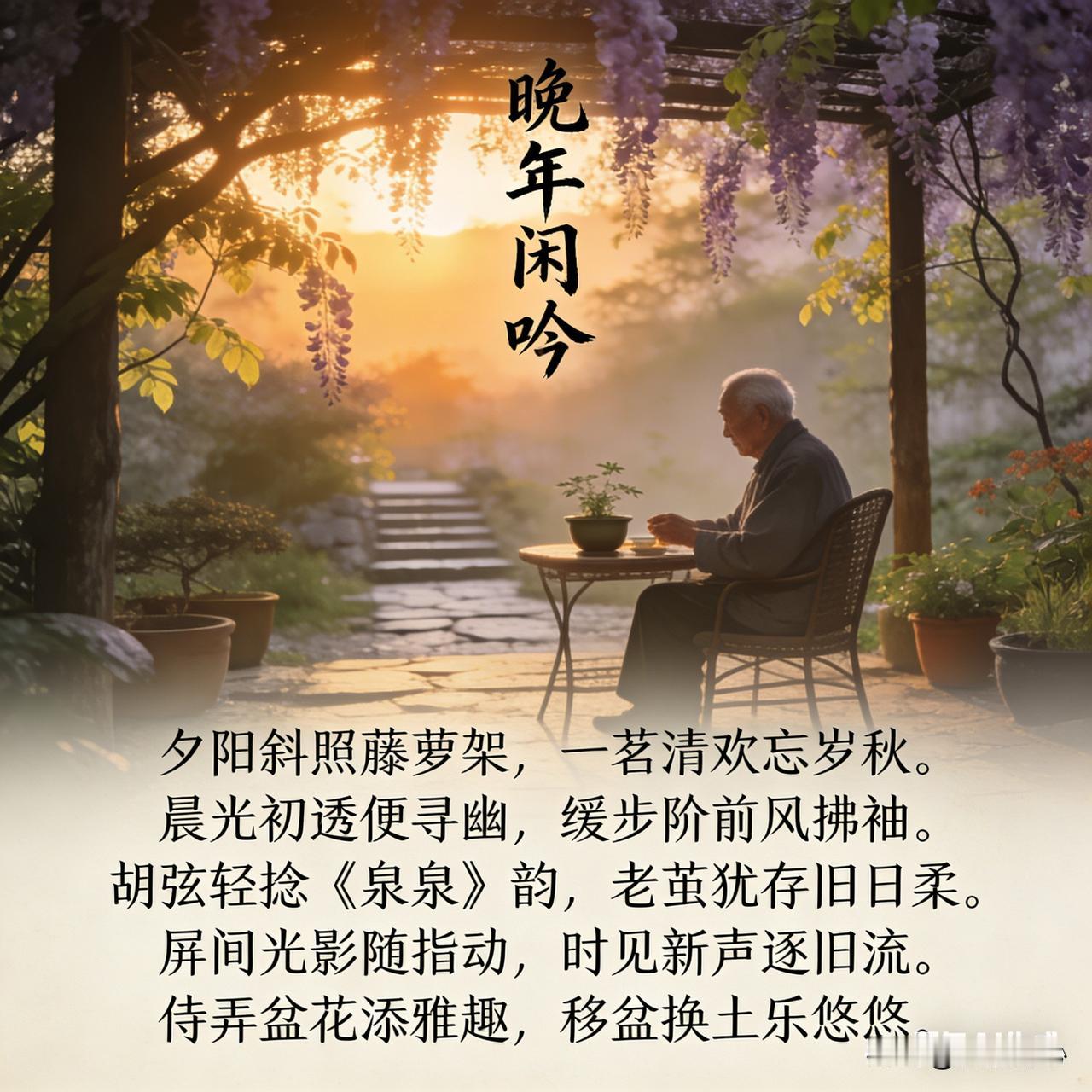《晚年闲吟》乐韵诗心原创诗词: 晨光初透便寻幽, 缓步阶前风拂袖。 胡弦轻捻《二泉》韵, 老茧犹存旧日柔。 屏间光影随指动, 时见新声逐旧流。 侍弄盆花添雅趣, 移盆换土乐悠悠。 夕阳斜照藤萝架, 一茗清欢忘岁秋。 这首诗词以“晨光散步”起笔,继写拉二胡,刷视频,养花等日常,“胡弦《二泉》”,“含岁”月沉淀,“屏间光影”融时代气息,末以“夕阳藤萝”,“清欢忘岁”收束,于平淡中见晚年安适,如青春记忆般以具象场景定格时光,显从容之态。