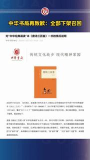 中华书局《唐诗三百首》下架召回,经典出版怎能“马大哈”? 你还敢放心买中华书局的经典读物吗?12月15日,中华书局因《唐诗三百首》“中华经典诵读”本存在讹误,宣布启动全部下架召回程序,这事儿让不少读者心里犯了嘀咕。 这本2012年首次印刷的书,因繁简转换、校订不彻底等问题出现多处错误,虽在2019年全面修订过,却仍有疏漏。 经典出版本应是严谨的事,中华书局这番操作,虽主动致歉召回,却也让热爱传统文化的读者难免失望。希望这次召回能把“窟窿”补严实,别再让经典读物在细节上“掉链子”了。