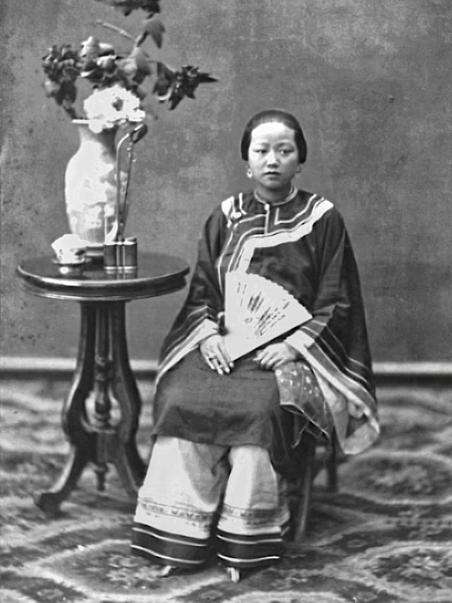 这是一张定格1880年广州大户人家女性的肖像,画面中的女子身着清代岭南服饰,斜襟宽袖的深色衣袍缀有条纹装饰,搭配浅色绣花纹饰的裤装,发髻梳作当时流行的样式,耳坠轻垂,神态端庄沉静,尽显世家女性的温婉仪态。 她身侧的精致小圆桌上,摆着两样物品,一是插着鲜花的瓷瓶,二是水烟袋,这是当时南北通行的大户人家常用器具,多以白铜、黄铜等材质打造,此刻静静置于桌上。