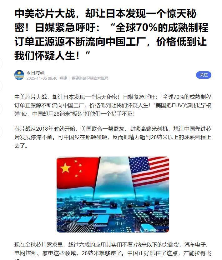 中方反制见效,却让日本发现一个惊天秘密!日媒紧急呼吁:“全球70%的成熟制程订单正源源不断流向中国工厂,价格低到让我们怀疑人生!”美国把EUV光刻机当“核弹”使,中国却用28纳米“板砖”打他们一个措手不及! 据媒体11月6日报道,最近,日本一些人就体验了这种“反转”的刺激。他们本想在半导体设备和材料上对我们“卡脖子”,拉上一众盟友搞“小院高墙”。 谁曾想,我们看似云淡风轻地调整了一下稀有矿产的出口策略,他们就有点坐不住了。 更让他们意外的还在后头。他们惊讶地发现,就在围堵得最热闹的时候,全球芯片市场的风向,居然悄悄变了。 为啥调整稀有矿产出口就让日本坐不住?日本官方自己都承认,他们造芯片需要的镓,85%以上都得从中国买;锗更是几乎全靠我们。 这两种东西是造芯片的关键材料,日本大厂商的原料全是从中国运过去的。 我们一收紧出口,他们的进口量直接跌了85%,日本有家材料厂的库存只够撑三个月,主管都急坏了。还有芯片厂因为缺原料,订单全延期,违约金赔到手软,这就是跟着美国搞封锁的下场。 可这还不算完,真正让日本傻眼的是全球芯片订单的流向。他们本来以为能拖慢我们,结果发现全球70%的成熟制程芯片订单,全往中国工厂跑。 这不是瞎编的,是日媒自己喊出来的,国际机构也证实了。可能有人不懂啥是成熟制程芯片,其实就是汽车、空调这些日常用品里用的芯片,不用最顶尖的技术,但用量特别大,占了全球芯片需求的八成。 美国把高端光刻机当宝贝想卡我们,却忘了这些接地气的芯片才是工业运转的根本,而我们偏偏在这领域做到了全球第一。 全球订单都来中国,就两个原因:便宜、供货稳。比如汽车上用的40纳米芯片,日本卖15美元一片,我们只卖3.8美元,质量还一样。 比亚迪这些车企都把订单从日本转到国内,逼得日本芯片厂只能闲着,还得裁员。中芯国际的28纳米芯片,比国际价低四成,合格产品比例还特别高。 格力空调、九阳破壁机里的芯片全用我们自己的,供货快还能按需定制,这就是我们的优势。 更让美日没想到的是,我们这28纳米“板砖”芯片还能弯道超车。我们用芯片堆叠技术,把28纳米芯片叠起来,性能差不多赶上7纳米的高端芯片。 华为的芯片从英伟达手里抢回四成市场,地平线的自动驾驶芯片也超过了英伟达。现在连移动基站、银行终端都用我们的国产芯片,说明我们的芯片在关键领域已经靠得住了。 这都是我们多年咬牙搞自主研发的结果。以前很多设备靠进口,现在上海微电子的28纳米光刻机、北方华创的设备都能自己造,还比进口的便宜。 从原材料到成品,我们自己都能搞定,生产线几乎满负荷运转,成本自然就降下来了,订单也就越来越多。 反观美日,封锁我们反而坑了自己。美国搞高端芯片每片都在亏损,我们的28纳米芯片每天都赚不少钱。 日本更惨,跟着美国丢了中国市场,自己的芯片卖不出去,原材料还被我们卡着。他们想找替代材料都找不到,日本官员都承认短期内没辙,这就是搞封锁的下场。 有人说我们高端芯片还落后,但先把成熟制程做好才能站稳脚跟。现在全球近七成成熟制程订单都来中国,未来每三片里就有一片是我们造的。资本只看产品好不好、便宜不便宜,不是美日靠政治施压就能改变的。 说到底,美日的封锁反而逼我们更强大。他们以为光刻机是“核弹”能锁住我们,却忘了中国越封锁越厉害。 我们用28纳米芯片打赢的这一仗,让全世界看到了中国的实力。日本发现的这个“秘密”,其实是我们多年积累的结果,也是他们跟着美国犯错的代价。 未来我们不仅要守住成熟制程,还要突破高端芯片,让美日的封锁彻底失效,这就是中国的底气!