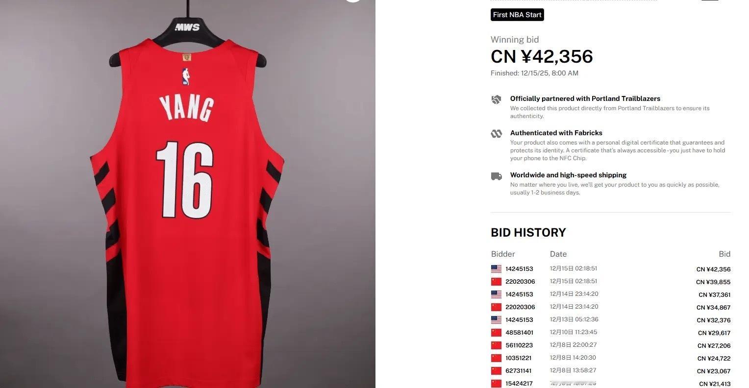SLAM:杨瀚森第一次首发球衣,以42356元成交价拍卖出售完成
