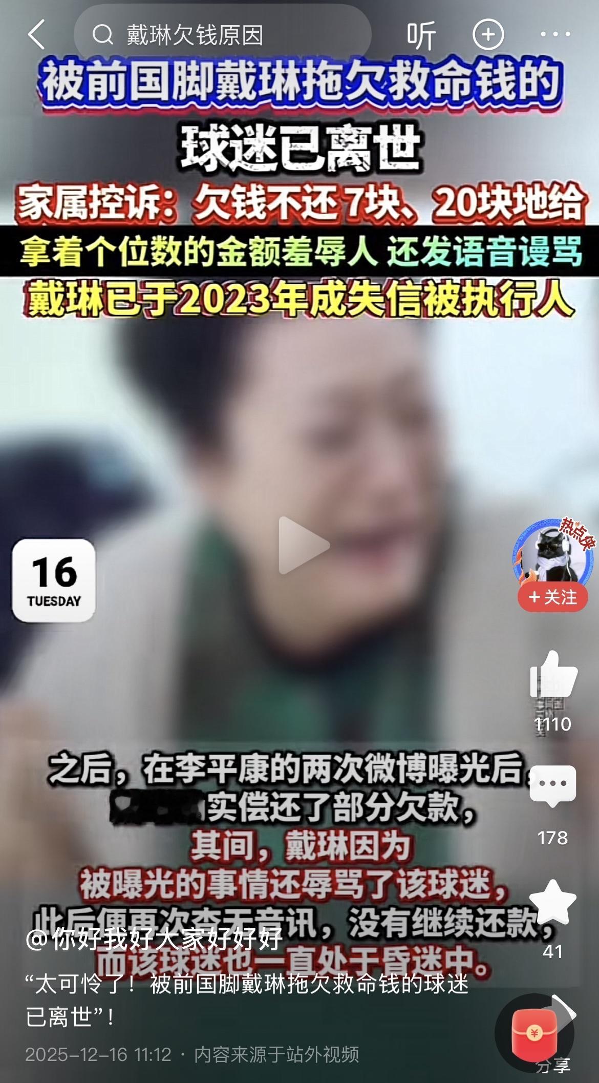 为这位球迷感到不值。23年10月戴已成失信执行人了,没被执行前,粉丝应该都知道戴的状况才多。在知道戴有负债前提下,还能借钱给戴,真球迷。 只可惜,戴可能是真的穷途末路了,辜负了球迷。据说他卖房还债,老妈出外打工帮还债。网传还钱记录截图,都是几米、二十米的还,负债人常规操作。 足球这个圈子,不能说人品都不行,但大部分或多或少有不良爱好,借之前,自己要做好拿不回来的心理,未必是不还,可能是真的没钱。