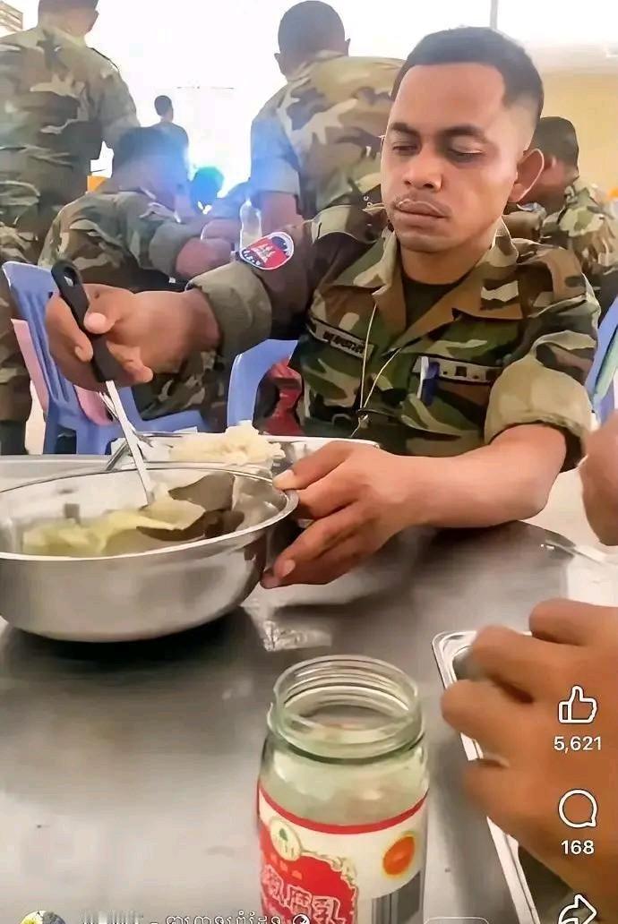 洪森就是守财奴,太抠门! 看看泰国士兵和柬埔寨士兵的阵亡抚恤金和前线的吃穿,真是千差万别。 柬埔寨士兵,吃白菜炖猪血,咱们产的豆腐乳,连越南人1970年代人手一双的回力鞋都没有,阵亡的柬埔寨士兵家属领几袋大米,这几袋大米估计都是柬埔寨民众捐出的新产大米! 反观泰国士兵,每餐四个菜,有肉,蛋,菜!总理去前线亲自加菜,泰国阵亡士兵抚恤金除了一次性几十万美金,家人后续每个月还能领取数百美元生活费。 这仗怎么打?