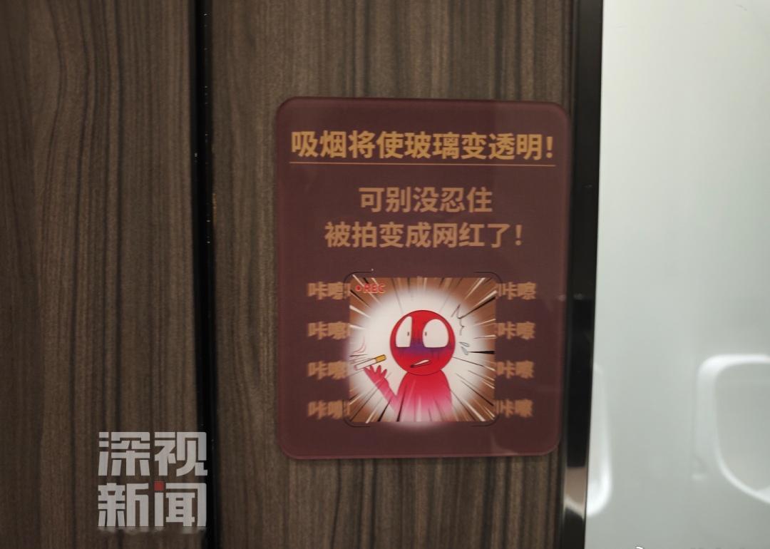 来到深圳罗湖区的水贝国际中心,在商场负一楼的男卫生间内可以看到,安装有特殊玻璃的厕所隔间旁张贴着一块醒目的警示牌,“吸烟将使玻璃变透明!可别没忍住被拍变成网红了”,金色字体旁还配有一个卡通化的“社死”表情包。