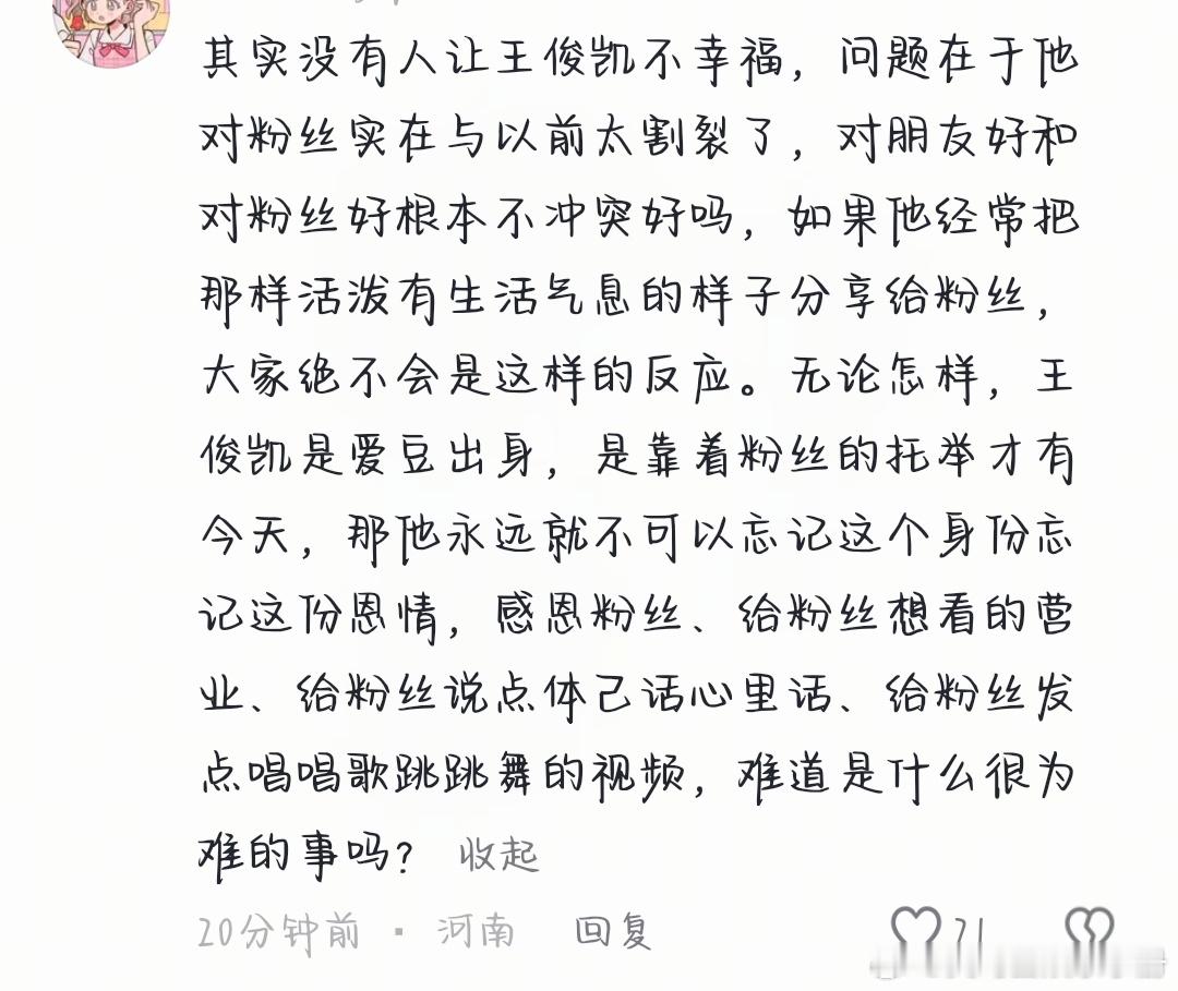 王俊凯脱粉热一了,有好多说是因为全红婵拍的视频里王俊凯很鲜活有落差感,还有说感觉这几年王俊凯很粉丝越来越远的!但也有觉得王俊凯一直都很真诚对待粉丝作为养成系出道的顶流,你觉得王俊凯现在和粉丝的关系如何?王俊凯 脱粉