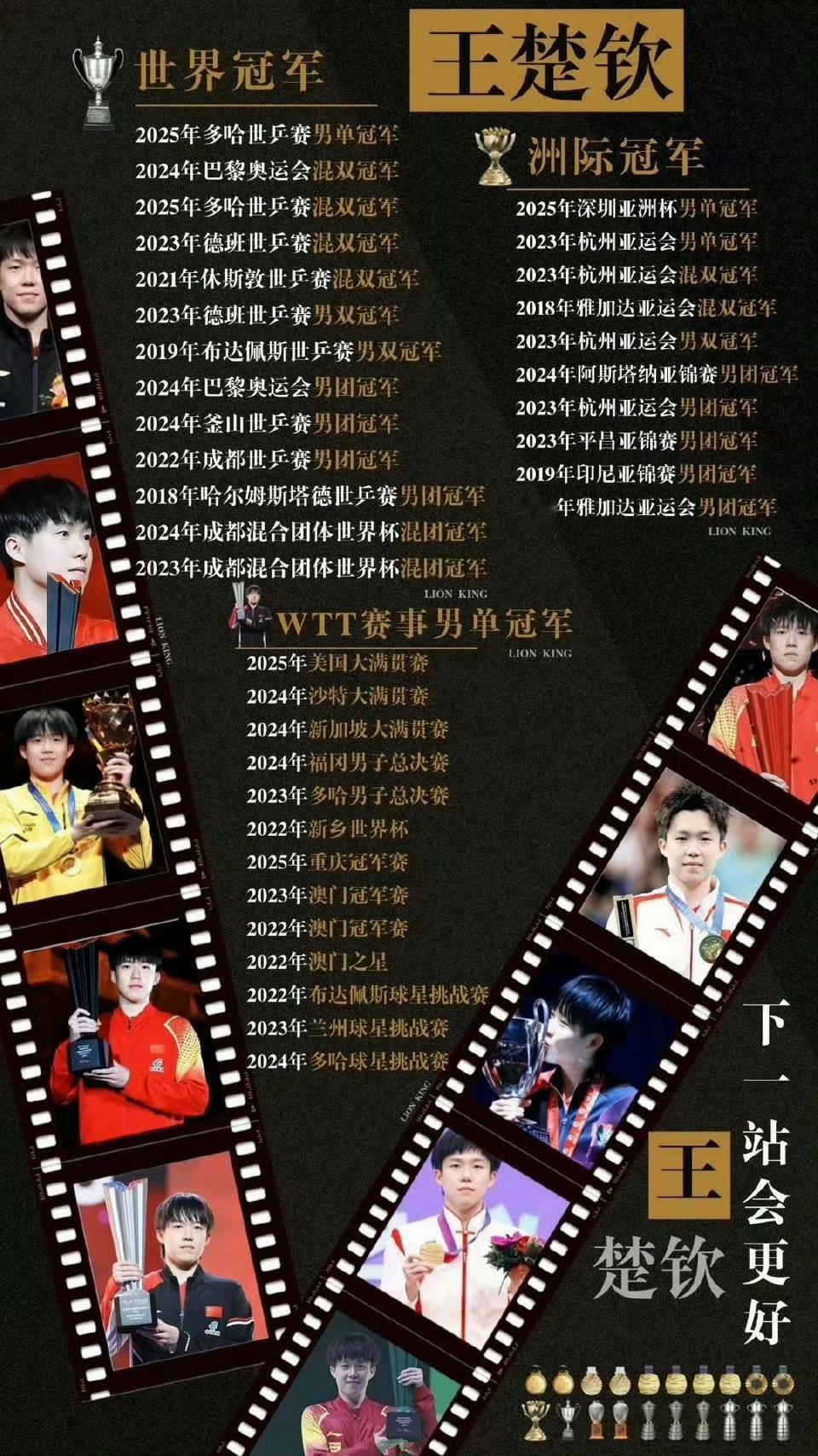 刚刚看了一下热榜,王楚钦又上榜了,词条:回顾2015年15岁的王楚钦。 2015-2025,15岁-25岁,王楚钦就是这样,从一个青涩少年一拍一拍打到我们面前,我们见证了他从青涩到成熟,从稚嫩到担当的蜕变。如今,他已然是世界乒坛首位“00后”男单世界冠军,王楚钦用十年写就一部成长史诗,他也从“小将”成长为扛起男乒大旗的“核心”。 十年荣誉:巴黎奥运混双金牌、多哈世乒赛男单冠军、亚运会四冠王等。 未来可期:期待继续脚踏实地,解锁更多成就,实现更大目标。 具体成就详见图。