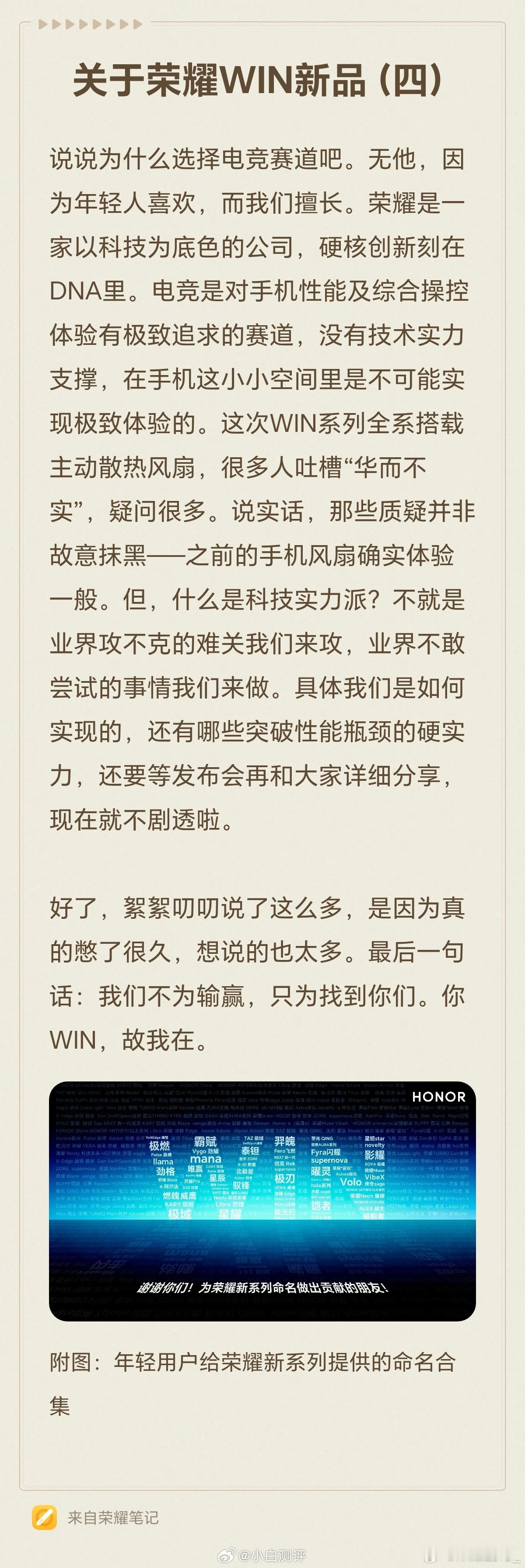 【荣耀WIN系列官宣本月发布】今天,荣耀正式宣布荣耀WIN系列将在本月发布,官方