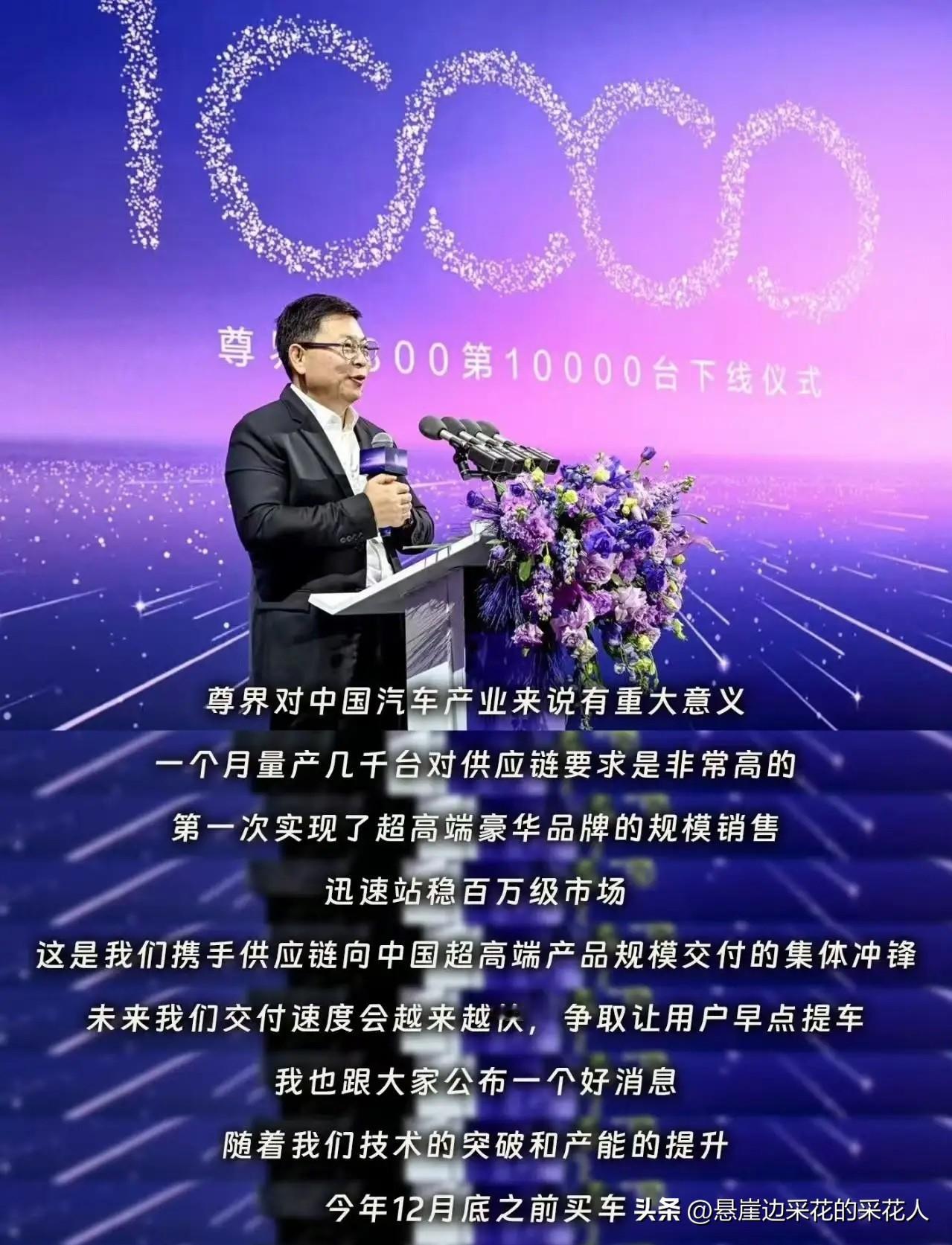 余承东亲自给李连杰交车!尊界第10000台重磅下线 余承东亲自给李连杰交车,这排面直接拉满!尊界第10000台车下线仪式超隆重,李连杰此前就说要入手,没想到拿下的正是这意义非凡的第10000台。 交车现场,李连杰站C位,身旁是尊界老总与余承东,两位大佬暖心递上钥匙。他还坐进车内细细体验,一看就是提前预约好的。要知道,尊界作为百万级豪车,从首台下线到破万仅用200天,豪华属性直接拉满! 仪式上余承东的演讲干货满满,直言尊界产能已稳步提升,目前月交付2000台,但这个速度还不够,后续会全力加码交付能力。毕竟年前年后正是需求旺季,尊界商务属性突出,不少公司将其作为激励好物,订单量居高不下。 在我看来,尊界的亮眼成绩,正是中国智造硬实力的最好证明!