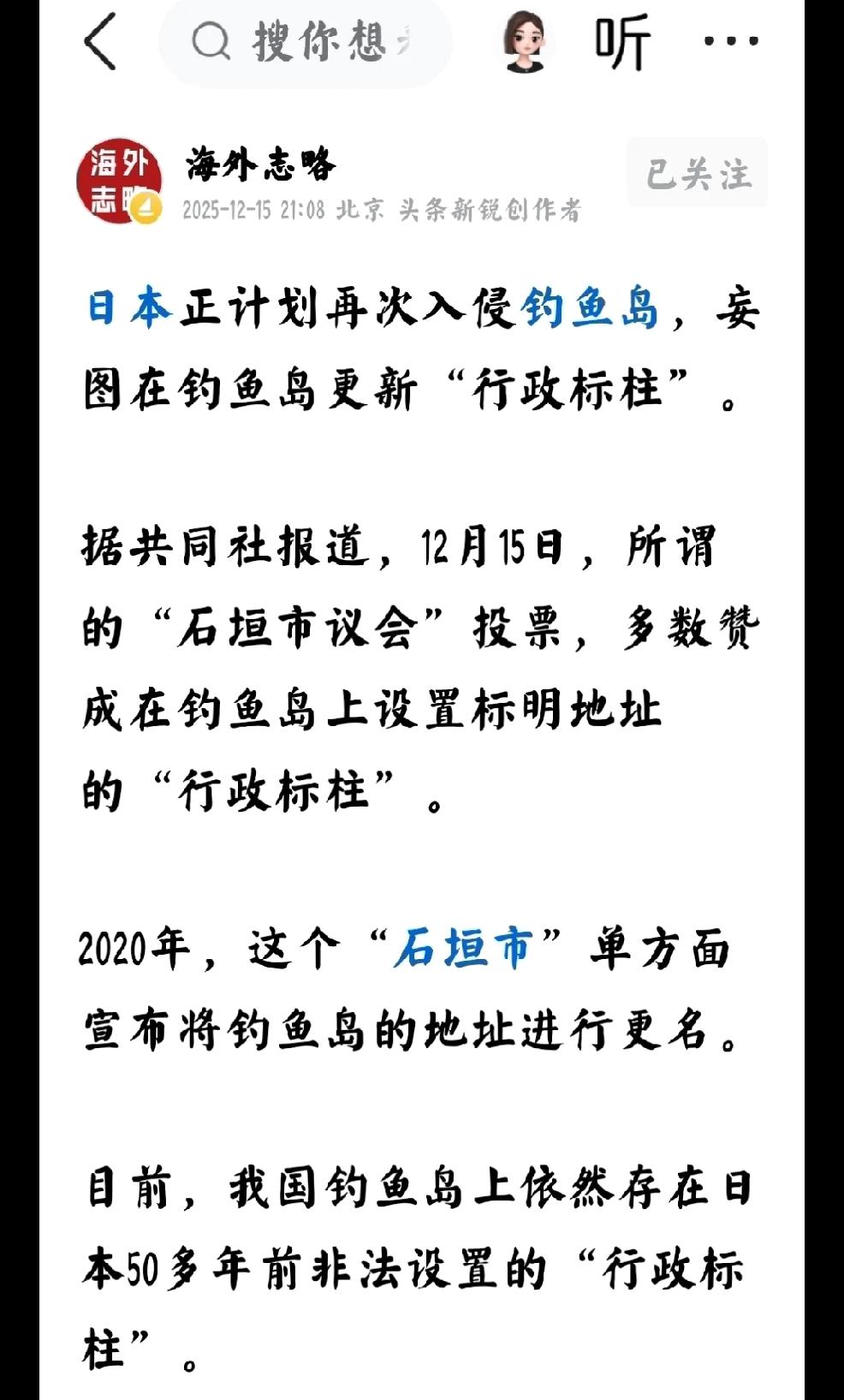 两条日方动态,说明什么? 个人观点:2025年12月16日,两条日本动态:日方在琉球最东端部署雷达部队;日方在钓鱼岛准备进行登岛标识。 这两条动态说明了:日方蓄谋已久,正在按计划实施。 个人建议:打断日方的实施计划,扰乱日方的节奏,或用调虎离山,或是声东击西,或是明修栈道暗度陈仓。加速我方的海军海警之实际步伐。 干扰对方,加速己方动作。化被动为主动,要牵着日方的鼻子走。