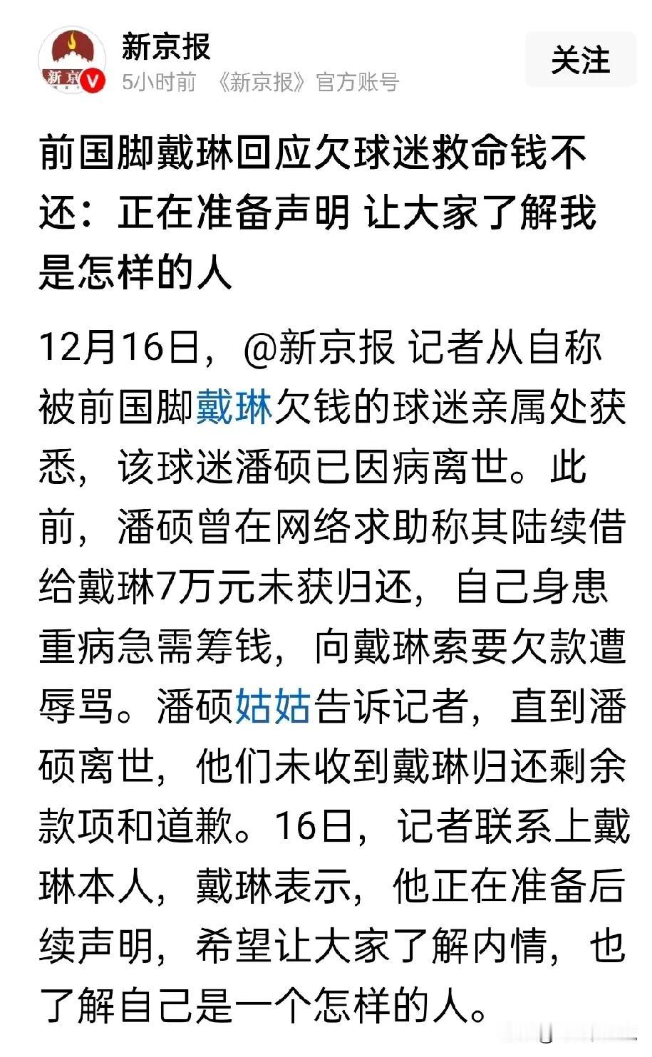 欠债不还就是老赖,再多的解释都没有用 如今欠债的活得好好的,考虑着如何完善自己的人设 而支持他借给他钱的球迷却因为看病缺钱而离开了人世 估计再多的解释都抵不住立马还钱加道歉 不然的话,金额虽小,仍然会有法院传票 有时候想不通这样的人品,凭什么进的国家队
