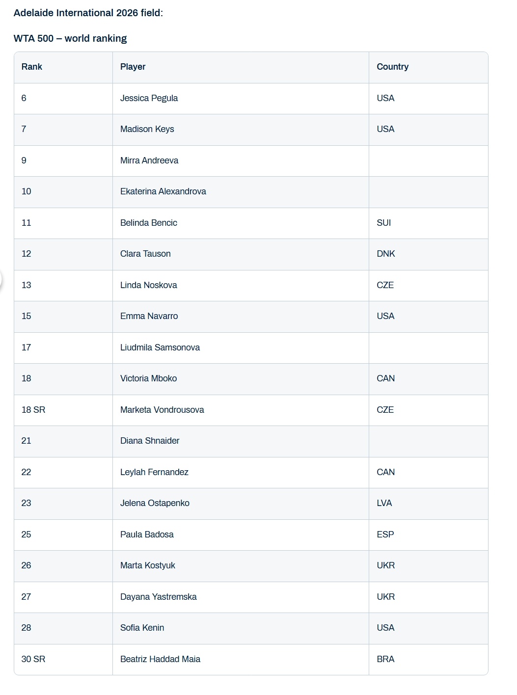 WTA500阿德莱德站公布参赛阵容📜佩古拉领衔,凯斯开启卫冕之旅,米拉·安德列娃、亚历山德洛娃、本西奇、陶森、诺斯科娃、纳瓦罗等球员都将亮相。这项500赛将在1月12日-17日进行。