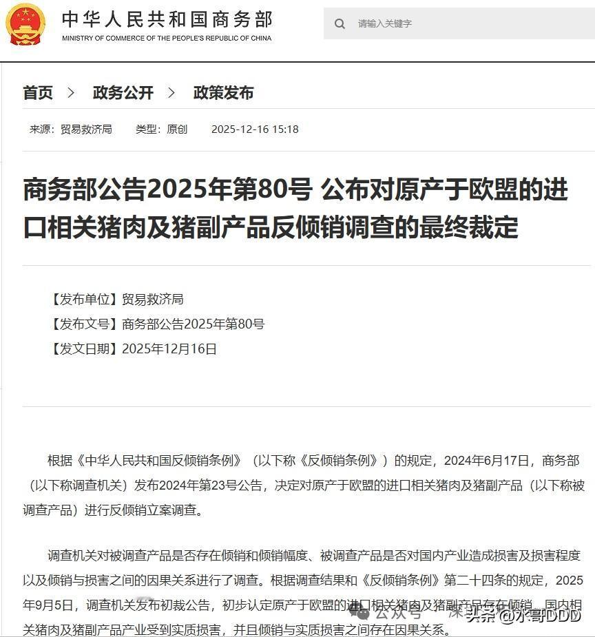 欧盟猪肉被征反倾销税:一场“猪”事背后的中欧暗战与中国农业大棋局 凌晨三点的郑州机场,一架来自哥本哈根的波音747货机缓缓降落。机舱里,不是游客,也不是芯片,而是被0℃恒温锁住的26吨猪耳、猪五花和猪前腿。然而,从2025年12月17日零时起,这些猪肉都要多交一笔最高19.8%的“反倾销税”。 税单背后,不只是一场贸易救济调查的终点,更是中欧在新能源、农产品、地缘话语权三条战线上的“交叉火力”。当欧盟委员会还在布鲁塞尔争论“中国电动车是否值得加税”时,北京用一纸猪肉税单告诉世界:贸易战没有“单选题”,只有“多线程”。 一、从“猪周期”到“猪外交”:一条产业链的生死时速 中国是全球最大猪肉消费国,年需求量约5500万吨,占全球一半。但中国也是全球第三大猪肉进口国,2024年进口量达235万吨,其中欧盟占比54%。 “进口猪”之所以横行,表面是价格:2024年6月,欧盟猪肉到岸均价1.38万元/吨,比国内规模化养殖场低1300元;深层是结构——欧盟生猪养殖规模化率90%,成本比中国散户低20%。 2024年3月,中国畜牧业协会向商务部提交反倾销申请书。商务部6月17日立案,9月公布初裁,12月16日落地终裁——从立案到终裁仅181天,比WTO规则允许的12个月缩短一半。 二、税单里的“精准打击”:谁被割,谁被保 最终税率表像一份“欧盟猪肉势力榜”:丹麦皇冠18.6%,西班牙Vall Companys 17.5%,荷兰Vion 16.3%,不配合企业一律19.8%。 更关键的是“征税范围”——鲜冷冻猪肉、猪杂碎、猪脂肪全部纳入,却刻意排除“加工香肠、火腿、培根”。这意味着,欧盟高附加值的深加工肉制品仍可零关税进入。 据海关测算,税单生效后,2026年自欧盟猪肉进口量将下降35%—40%,约80万吨缺口将由国内头部企业及巴西、智利、俄罗斯供应填补。 三、布鲁塞尔的“错愕”:电动车加税的回旋镖 欧盟委员会发言人10月曾公开呼吁“希望中方避免贸易救济武器化”,但北京仍按既定节奏落地终裁。外媒普遍解读为“报复”——2025年10月30日,欧盟对中国电动车加征最高35.3%反补贴税正式生效;59天后,中国以猪肉税单“回礼”。 数字比对更显微妙:2024年中国电动车对欧出口额约128亿欧元,欧盟猪肉对华出口额仅28亿欧元——表面不对等,但“杀伤力”不能只看金额。欧盟猪肉高度依赖中国市场,西班牙白猪肉出口42%销往中国,丹麦皇冠在华收入占其总营收18%。 四、中国猪业的“阳谋”:从“防守”到“反攻” 反倾销税只是序章,更宏大的剧本藏在2025年中央一号文件征求意见稿里——“建设国家猪肉储备中心”“鼓励生猪养殖‘走出去’”。 短短三年,中国企业在巴西、智利已控股5家屠宰厂,年产能120万吨;2026年还将在阿根廷火地岛建全球最大单体猪肉加工厂,年产能70万吨,专门对欧出口高附加值火腿、香肠——用“南美成本+中国资本”反向打入欧盟市场。 国内同步启动“生猪期货+保险+信贷”三位一体改革,2025年12月19日,大连商品交易所将正式挂牌“猪肉期货期权”,让养殖户能在18个月前锁定利润。 五、世界餐桌的“新坐标” WTO数据显示,1995—2024年全球农产品反倾销案共637起,其中中国发起的仅41起,占比6.4%;同期中国农产品被反倾销179起,占比28%。 更值得玩味的是“公共利益审查”——中国商务部在终裁前走访北京、上海、广州三座城市1230户居民,发现猪肉价格上涨5%对CPI拉动仅0.08%,社会承受度“可接受”;反观欧盟,2025年11月通胀仍高达4.1%。 当哥本哈根的货机再次降落,关税单已经悄悄装进报关员的文件夹。欧盟猪肉依旧会出现在中国人的厨房,只是价格标签上多了几行小字:反倾销税、汇率、南美替代率。 一场关于“猪”的暗战,表面是关税,深处是产业链、选票、规则与话语权的综合较量。中国用181天告诉世界:贸易战没有“单选题”,谁想拆别人的台,就得先算清自己会不会掉下去。 欧盟对等关税 反倾销制裁 欧盟对华反倾销 欧盟关税提案 欧盟加收关税 美国反倾销产品 对美反倾销 进口欧盟猪肉 欧盟进口猪肉 欧盟猪肉进口 进口猪肉反倾销 猪肉反倾销调查 中欧猪肉 猪肉进口关税 反倾销税解读
