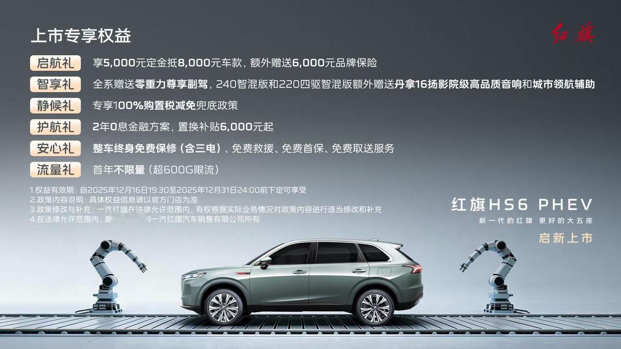 【售价17.88万元起,红旗HS6 PHEV正式上市】12月16日,红旗HS6 PHEV迎来正式上市,推出3款车型,售价区间为17.88万元-22.88万元。外观方面,新车延续品牌标志性“高山飞瀑”格栅,12根镀铬线条源自祈年殿檐柱设计,搭配熏黑前大灯、家族式镀铬装饰条及车头红旗LOGO装饰,视觉上典雅华贵。提供星河黑、雪耀白、揽月银以及苍夜山海四种车身色彩。车身尺寸方面,其长宽高分别为4925/1970/1740mm,轴距为2925mm。内饰方面,新车采用了内嵌式的小尺寸矩形全液晶仪表盘,并搭配双色三辐式多功能方向盘,中控台搭载15.6英寸2.5K分辨率的多媒体屏与副驾屏双联屏,内置高通骁龙8295P芯片。动力方面,新车搭载1.5T插电式混动系统,发动机的最大功率110千瓦,电机组合也提供168千瓦前电机,或者168千瓦前电机+201千瓦后电机(四驱)。电池方面,车辆提供23千瓦时和40千瓦时两种规格,纯电和综合续航分别达到148/1580公里(23度电两驱)、248/1650公里(40度电两驱)、228/1460公里(40度电四驱)。辅助驾驶层面,搭载以视觉为主的司南智驾系统,功能上包含了高速导航辅助、主动通过ETC闸口、拨杆变道、记忆行车、遥控和记忆泊车等功能。【来自懂车帝车友圈】