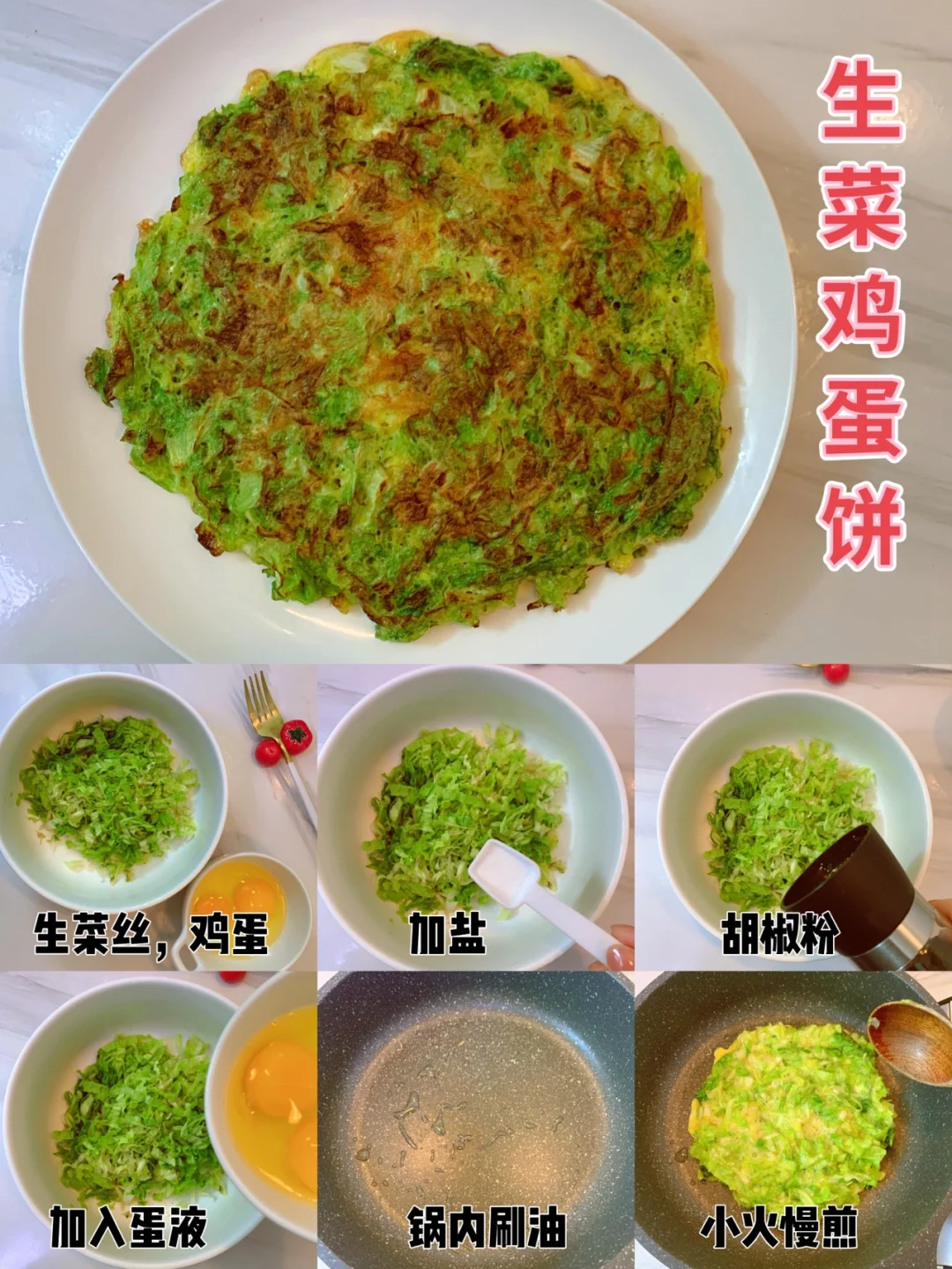 📣做法:生菜切丝加盐🧂胡椒粉腌制两分钟,加入蛋液拌匀,锅内刷油烙制定型即可。