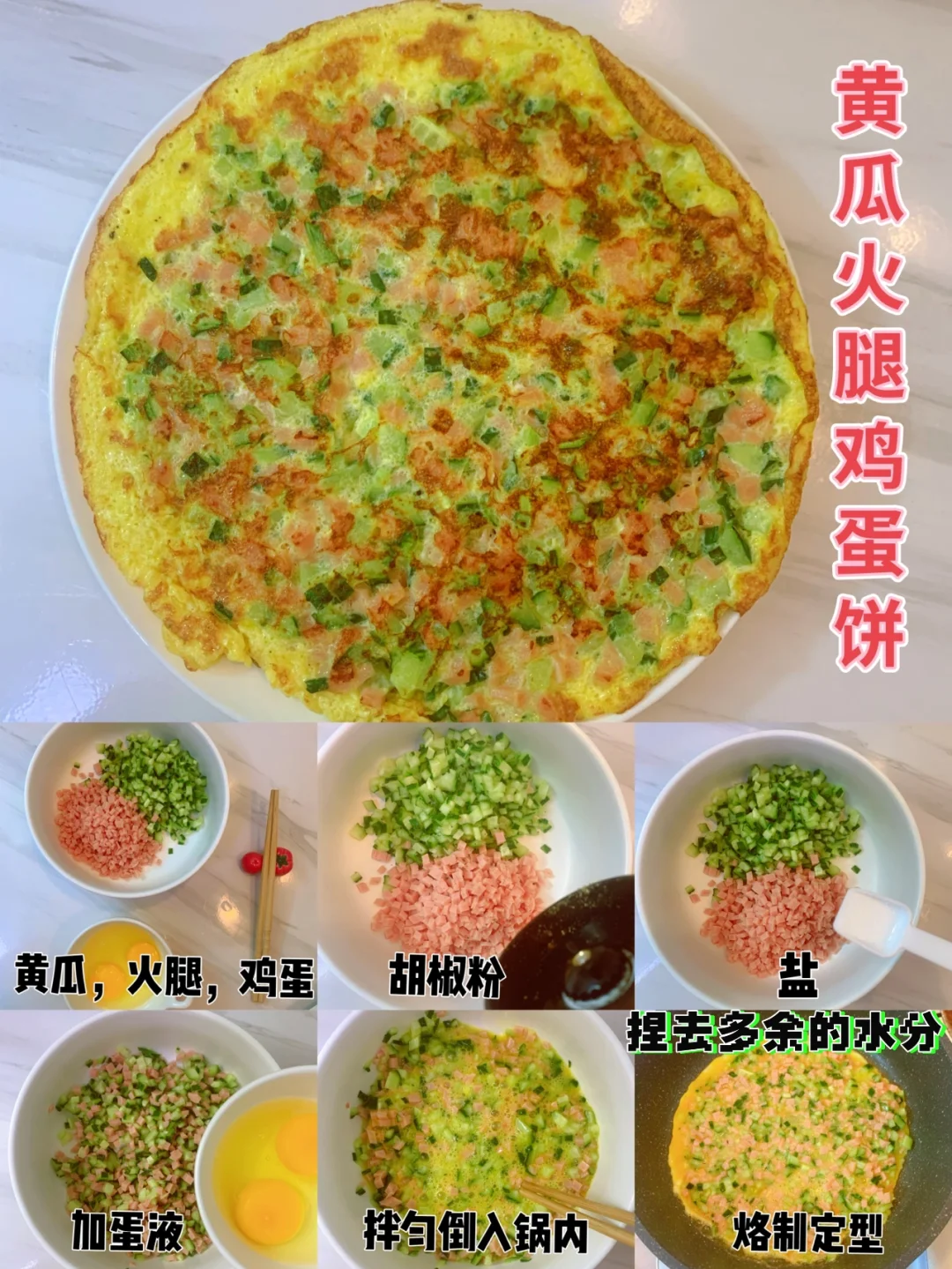 📣做法:黄瓜🥒,火腿切丁,加盐🧂胡椒粉腌制五分钟,捏去多余水分,倒入蛋液搅匀,锅内刷油烙制定型即可。