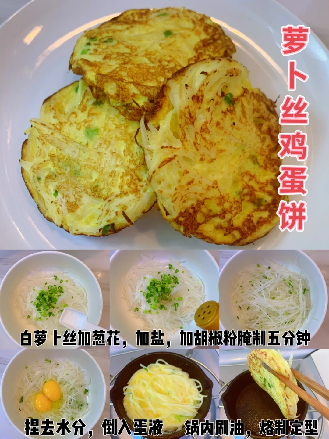 📣做法:白萝卜切丝加入葱花,加适量盐🧂,胡椒粉腌制五分钟,将腌好的萝卜丝捏去多余的水分,加入蛋液搅匀,锅内刷油烙制定型即可。