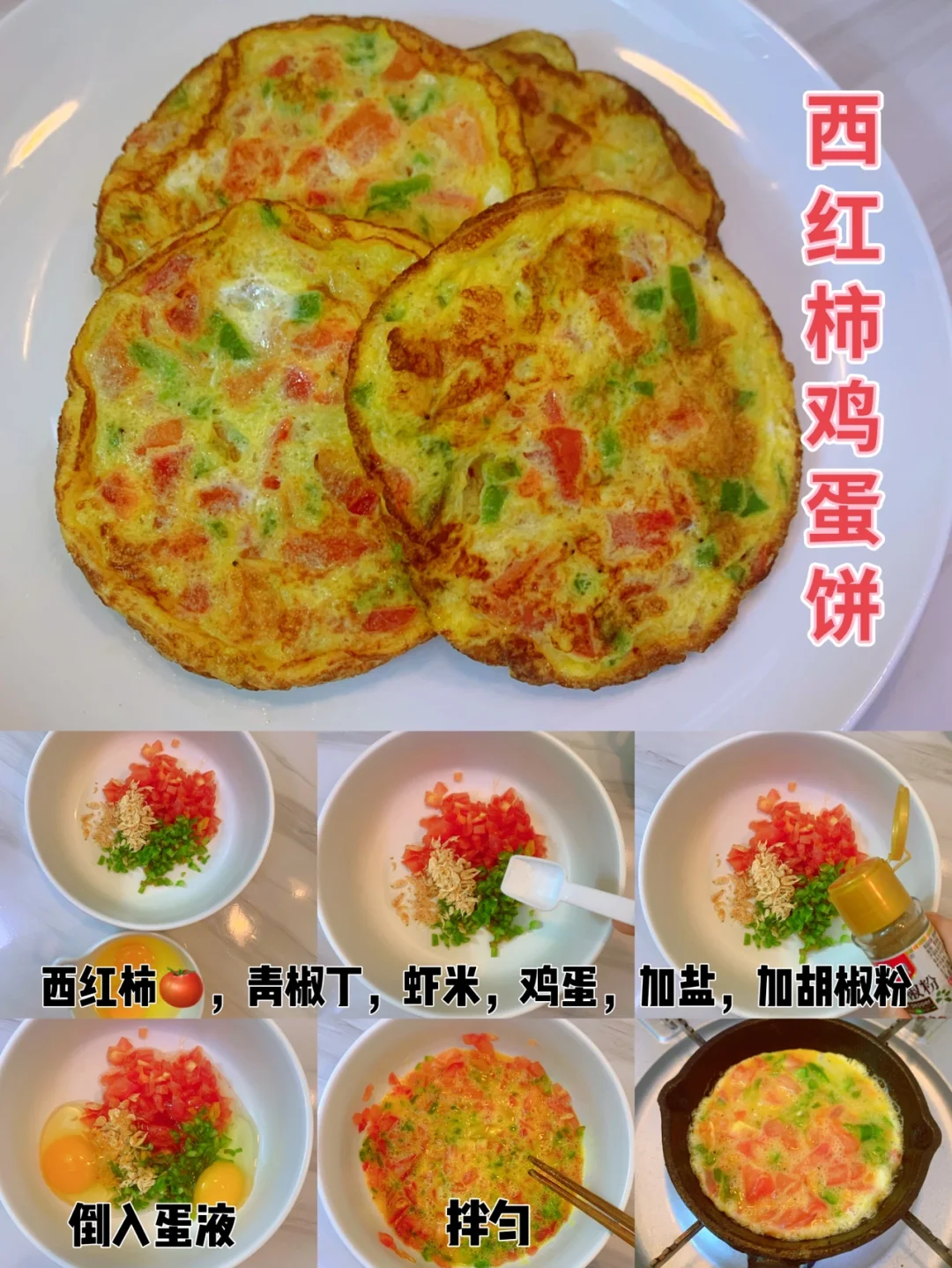 📣做法:西红柿青椒切丁,加入一勺虾米,加适量盐胡椒粉,加入蛋液搅匀,锅内刷油,倒入拌匀的蛋液烙制定型即可。