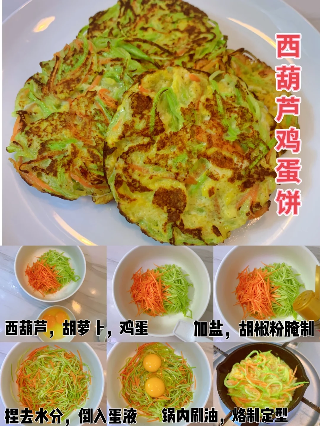 📣做法:西葫芦胡萝卜🥕切丝,加盐胡椒粉腌制五分钟,捏去多余水分,加入蛋液,锅内刷油烙制定型就🆗了