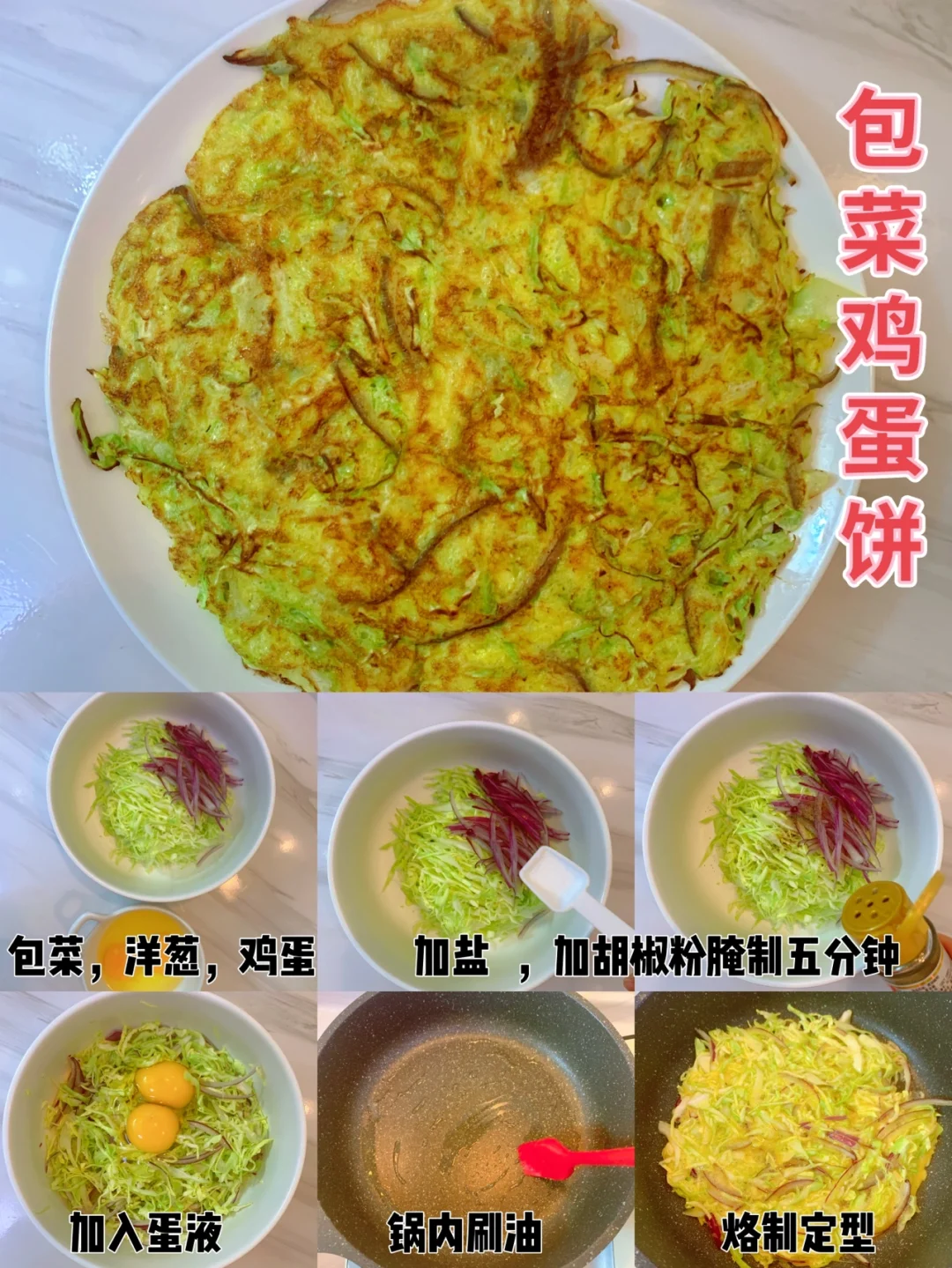 📣做法:包菜,洋葱切丝,加盐🧂胡椒粉腌制五分钟,加入蛋液,锅内刷油烙制定型。[偷笑R]