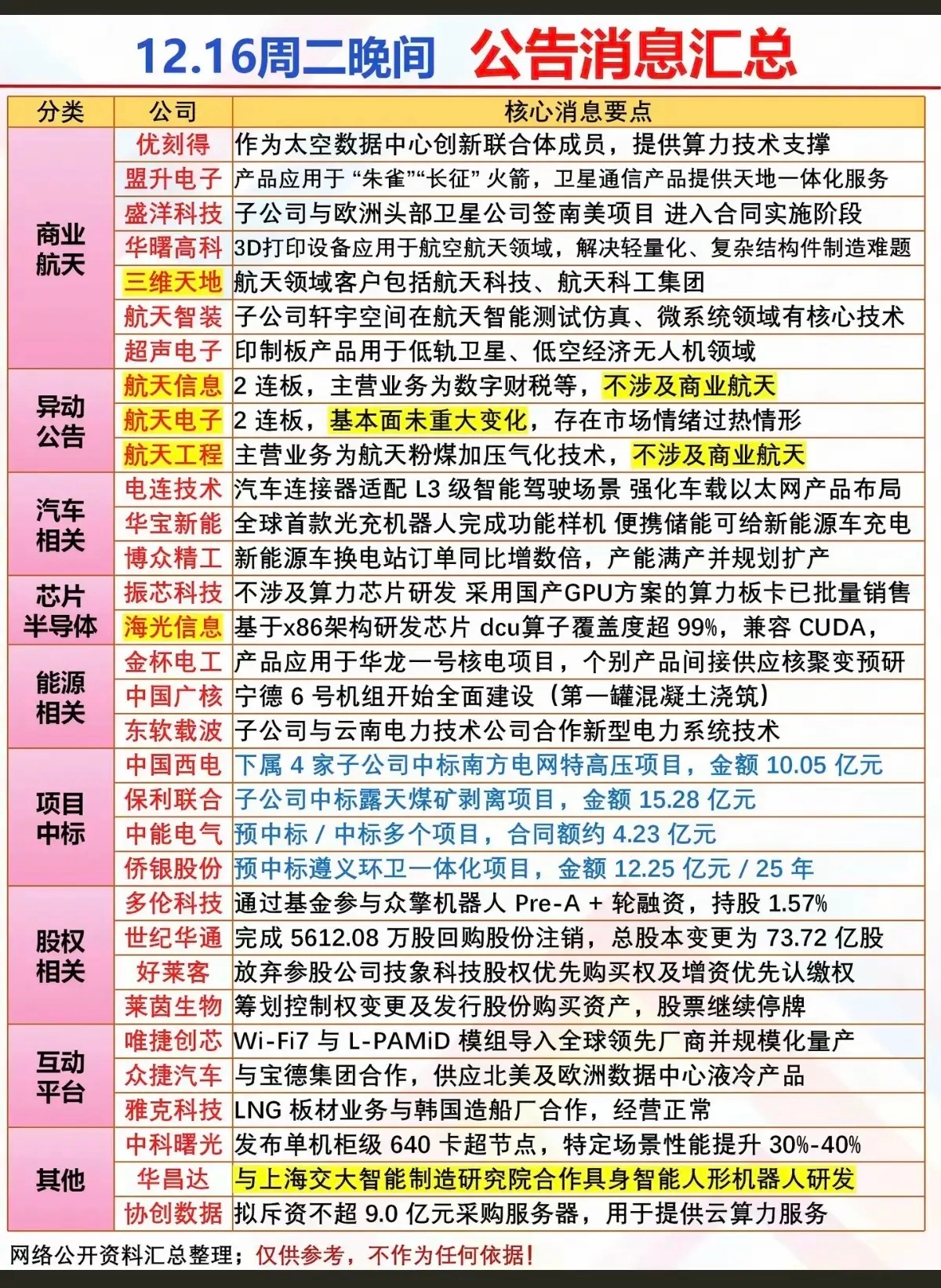 12.16周二晚间 最新:公告汇总!晚间重要上市公司公告汇总:涉及股权变更,汽车,芯片半导体,能源,公司经营,中标订单等、
