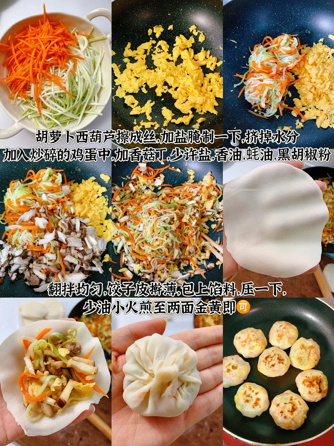 求求你们快去做!巨巨巨……好吃!外酥里软皮薄馅多的小馅饼,真的是香迷糊啦!一口下去超满足,怎么吃都不腻,喜欢吃辣的可以搭配蘸汁! 家人们一定要去试试啊~ 💯减肥不知道吃什么的,请关注我 做法见图片☝🏻☝🏻☝🏻 🕐时间:10-15分钟 ⭐难度:零厨艺✌️ [向右R]食材:鸡蛋🥚,西葫芦,胡萝卜,香菇,饺子皮 ✅碳水:饺子皮 ✅蛋白质:鸡蛋🥚 ✅膳食纤维:香菇,胡萝卜,西葫芦 [向右R]馅料调味品:香油,蚝油,黑胡椒粉