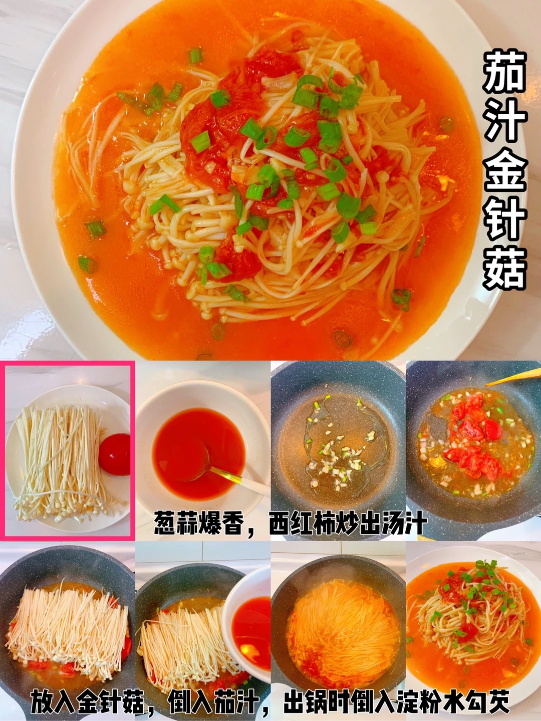 ♨️做法:番茄1个去皮切块,油热加葱蒜末番茄块,炒至出汤汁后加入金针菇,倒入茄汁,根据口味加盐,煮制汤汁浓稠,出锅时倒入淀粉水勾芡。