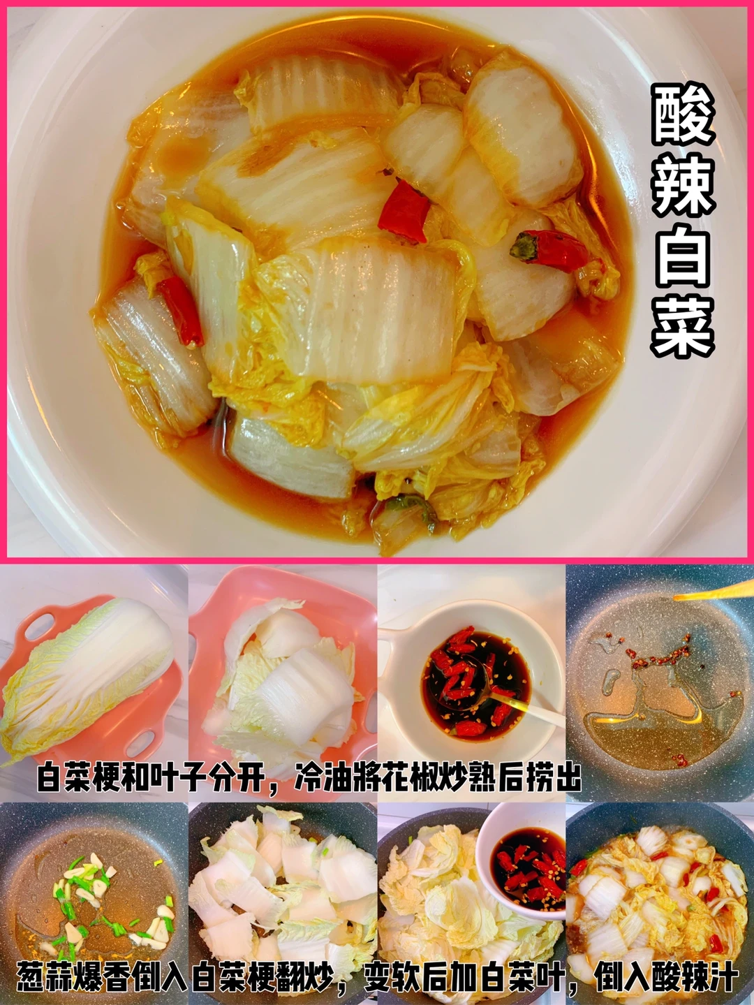 ♨️做法:白菜菜梗和菜叶分开,手撕成块备用,锅内热油,加入少许花椒爆香后捞出花椒(出锅后吃到花椒会影响口感),葱蒜末爆香,白菜梗炒软后加入白菜叶,倒入酸辣汁炒至白菜变熟。