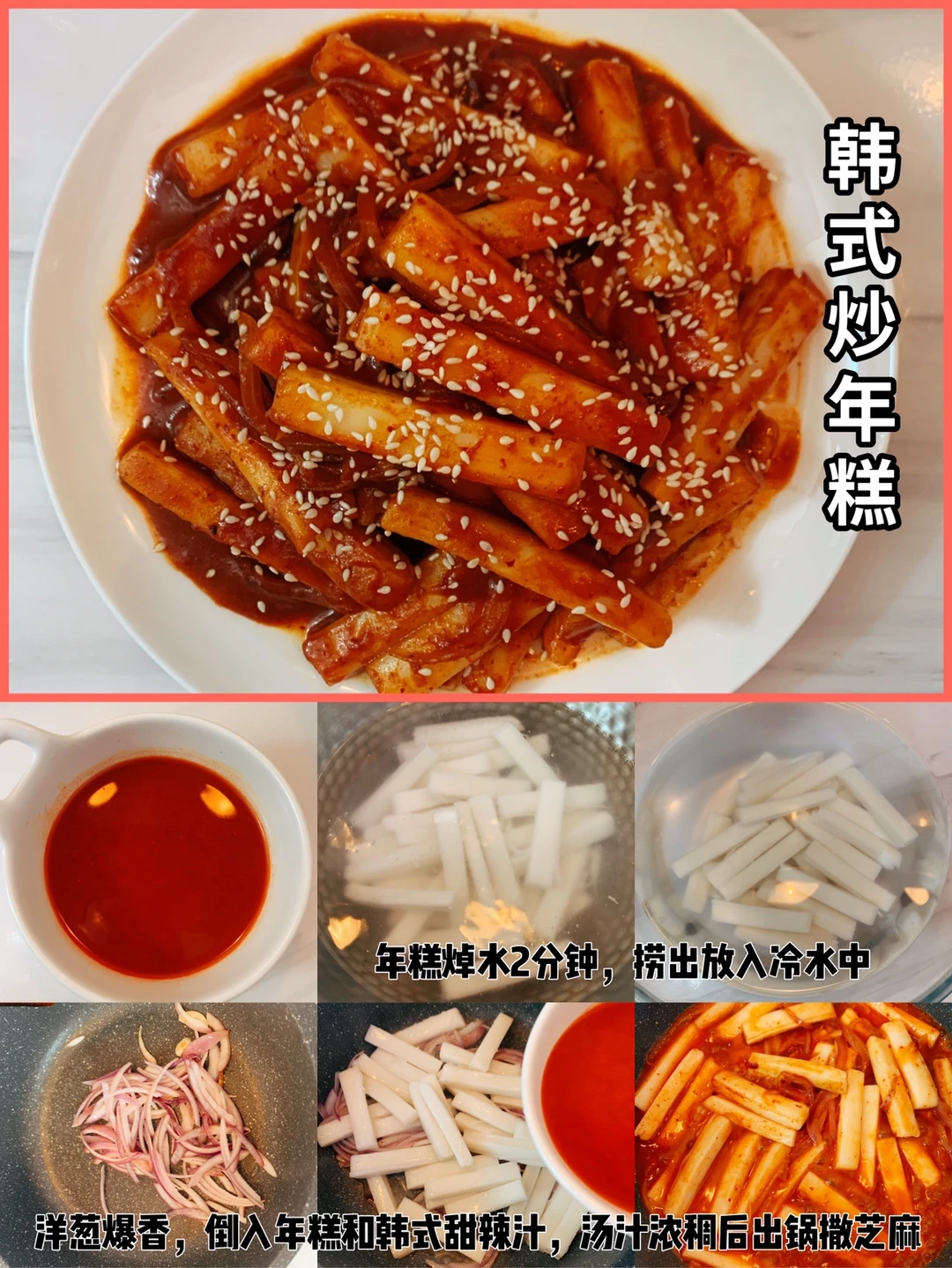 ♨️做法:年糕煮熟过冷水,油热下洋葱炒香,加年糕和韩式酱汁煮制汤汁浓稠,出锅撒上白芝麻即可。