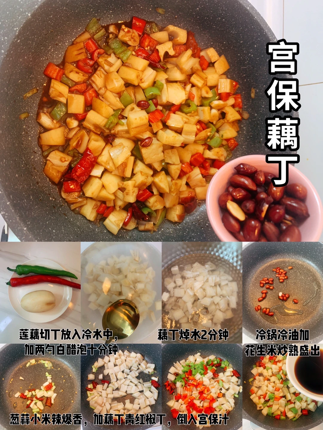 ♨️做法:莲藕切丁加两勺白醋清水泡十分钟,藕丁焯水2分钟捞出,锅内凉油加花生米,小火炒至花生米变熟盛出,葱蒜末炒香,加藕丁青红辣椒丁宫保汁翻炒,起锅时倒入淀粉水勾芡,起锅加花生米更好吃。