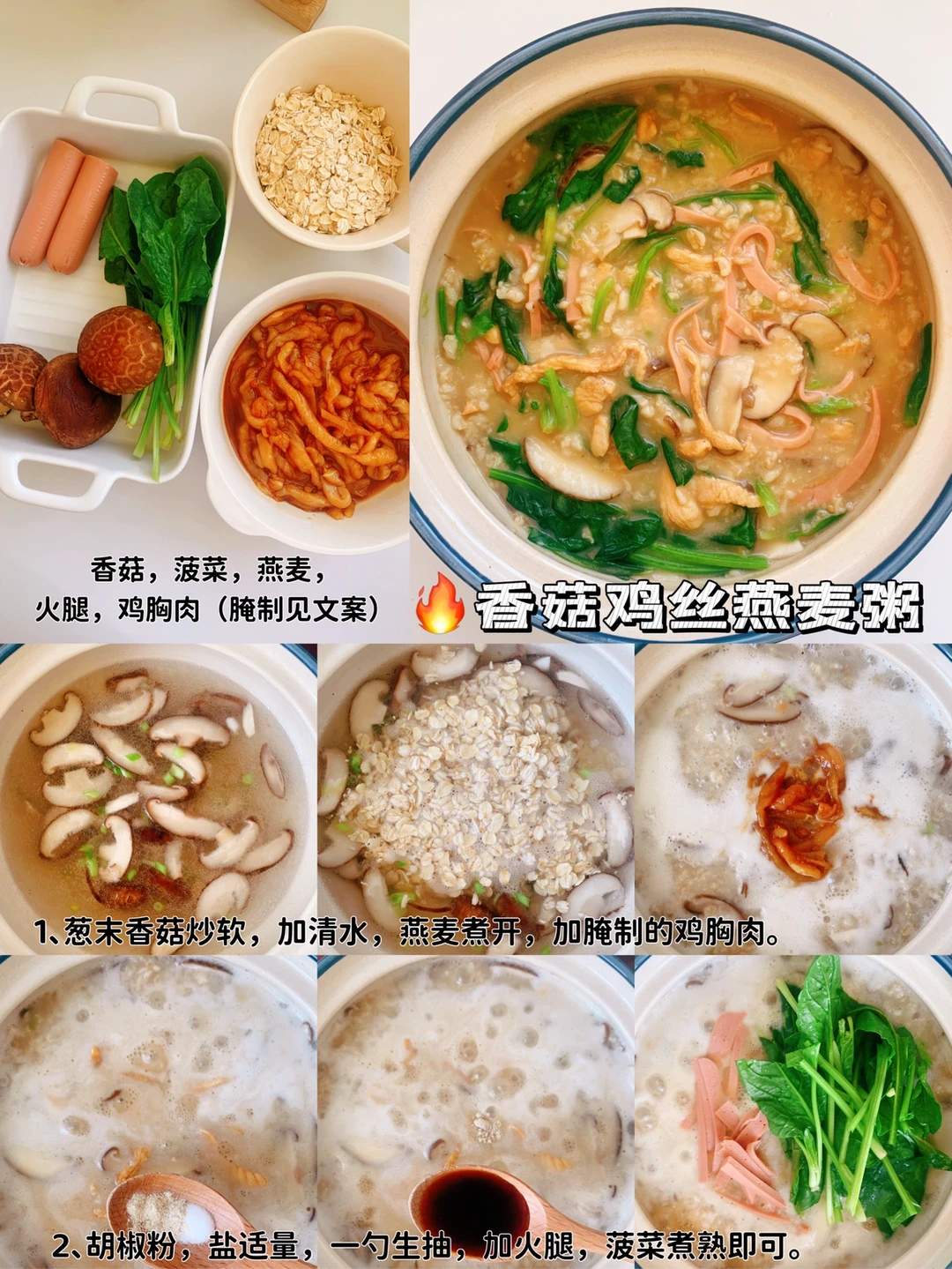 燕麦➕香菇➕菠菜➕火腿➕鸡胸肉