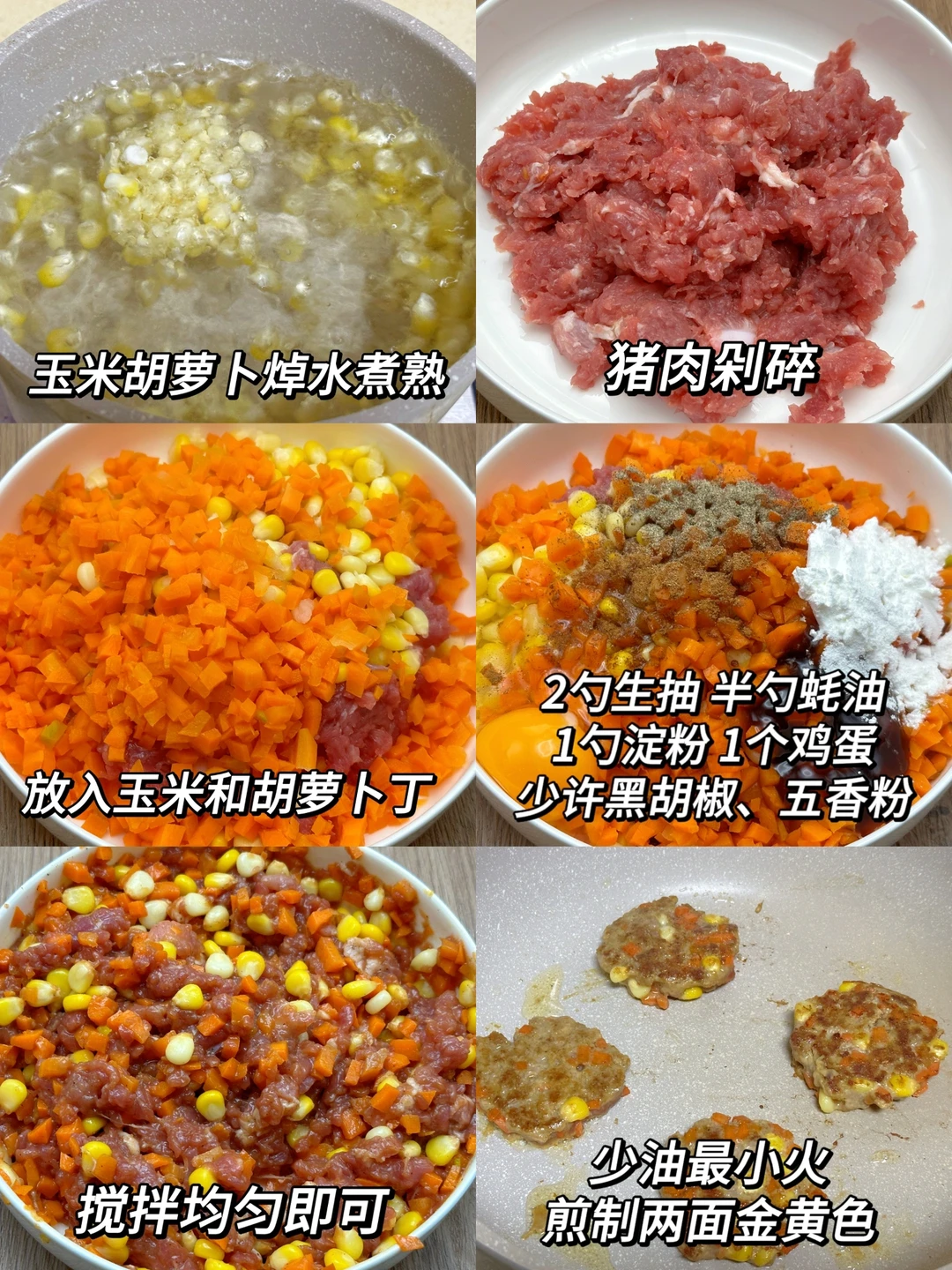 1⃣️胡萝卜切丁、胡萝卜丁和玉米粒全部倒入锅中煮熟2⃣️把猪肉剁成肉泥,食材全部倒入碗中,倒入2勺生抽➕半勺蚝油➕少许黑胡椒粉➕少许五香粉➕一个鸡蛋➕1勺淀粉用筷子搅拌搅拌,顺时针搅拌均匀